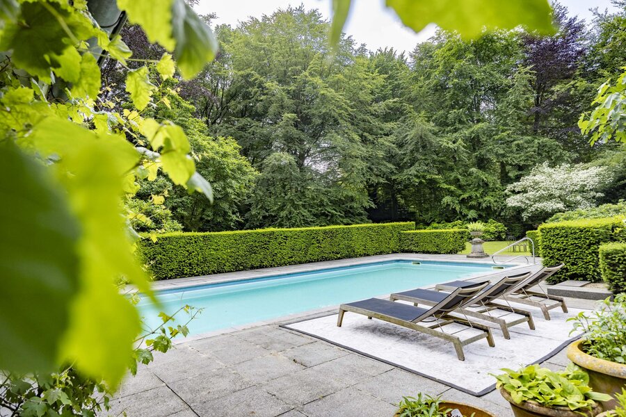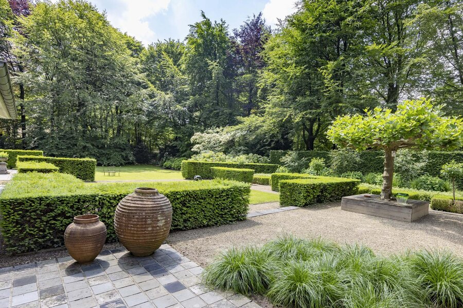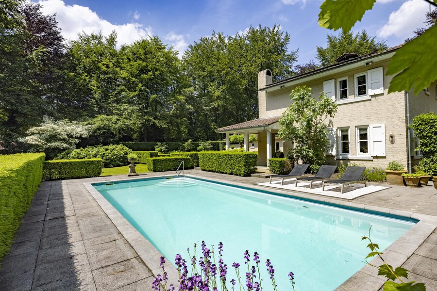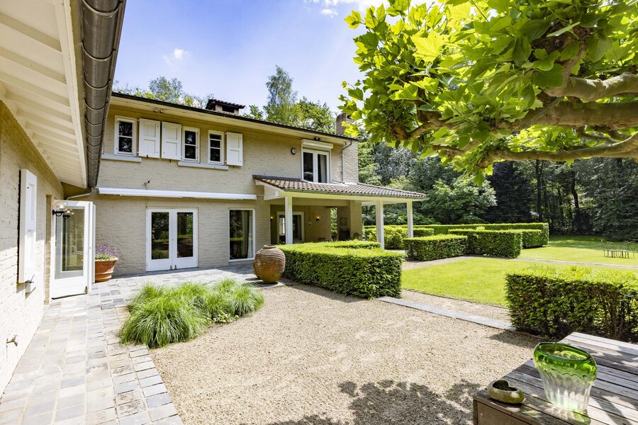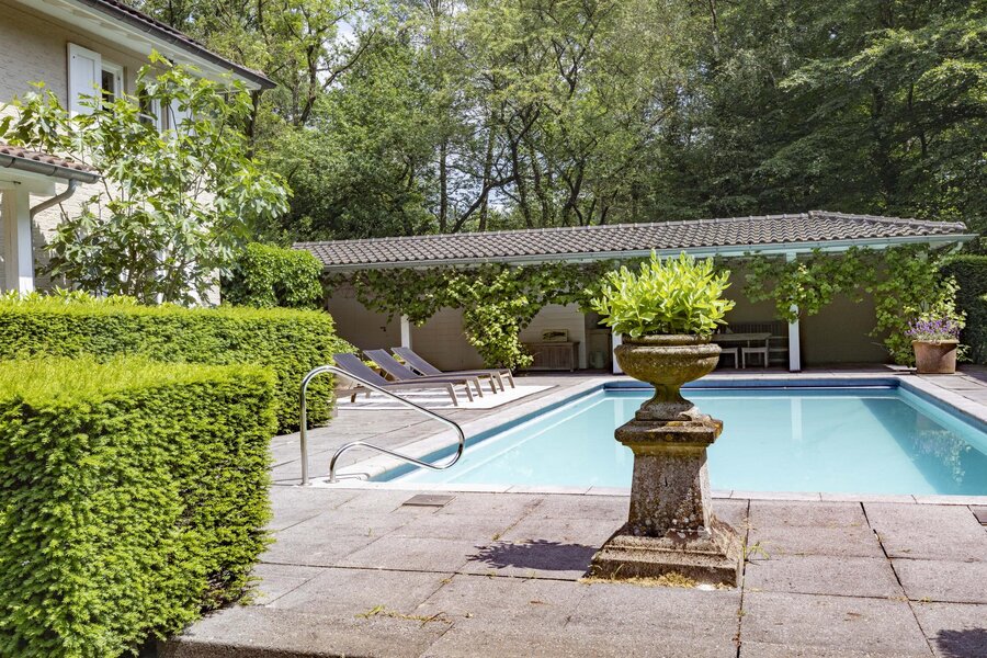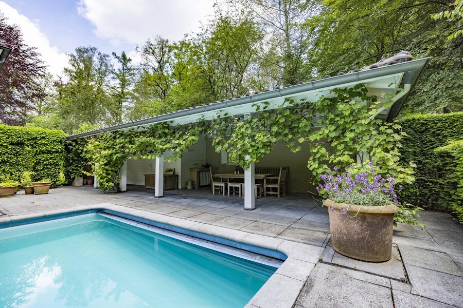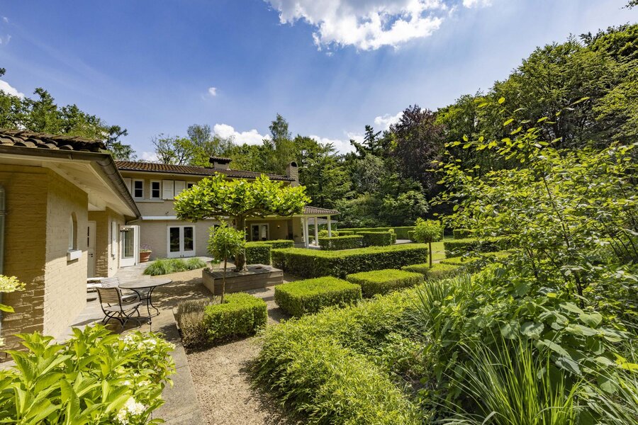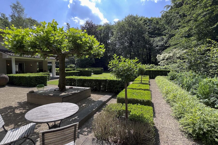 De zonnige, onder architectuur aangelegde, tuin (Buro Van Hasselt) heeft diverse terrassen met sierbestrating, gazon, borders met volwassen beplanting, een strak lijnenspel van hagen en diverse soorten bomen. De tuin loopt vloeiend over in de bosrijke omgeving met diverse soorten naald- en loofbomen. Het verwarmde zwembad met poolhouse is beschut gelegen en heeft een terras voor loungebedden met totale privacy.