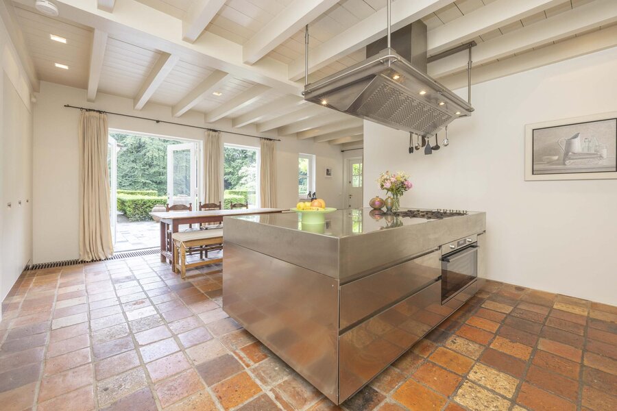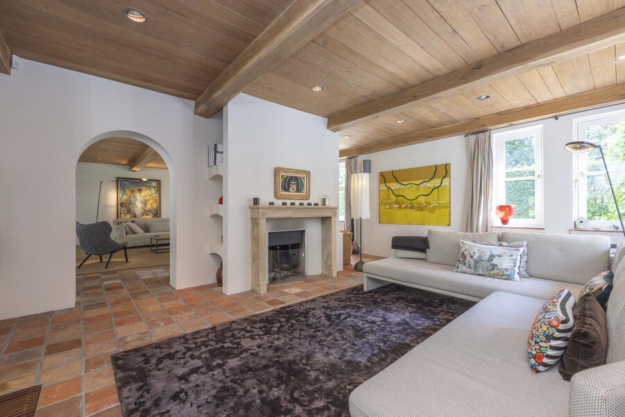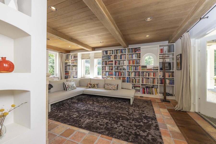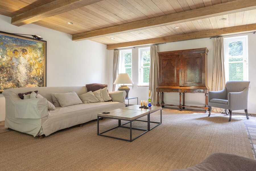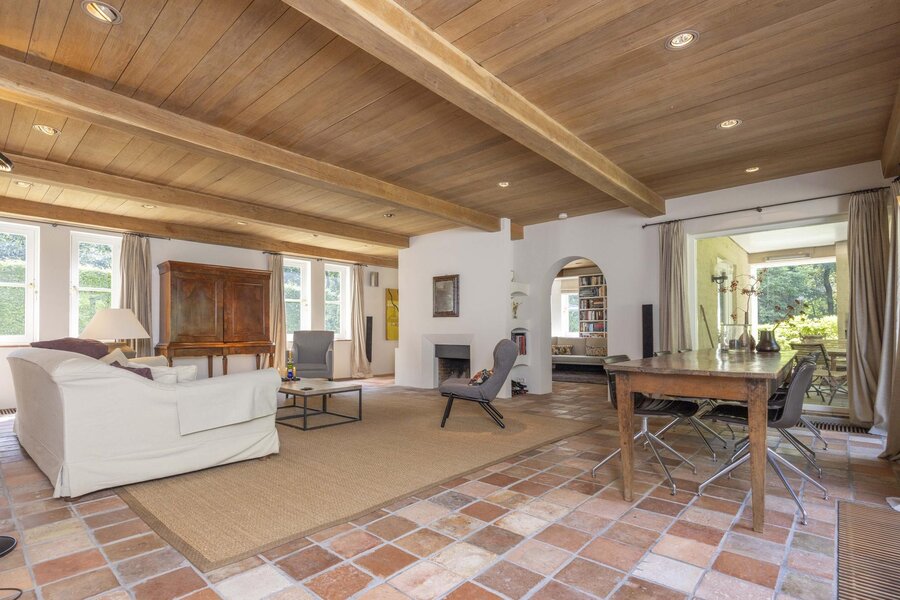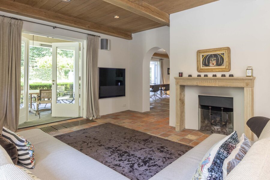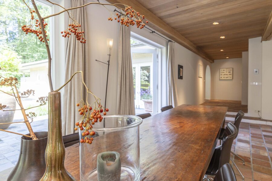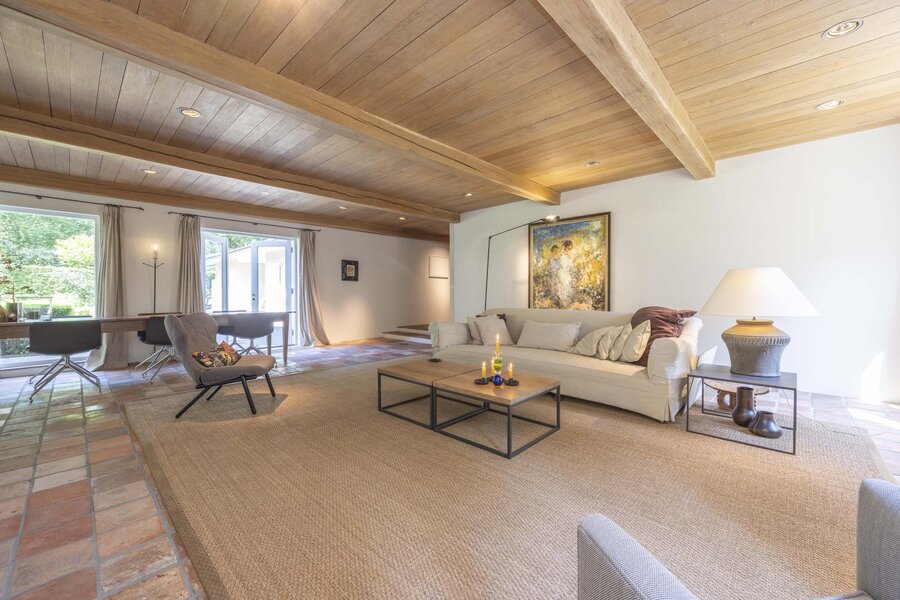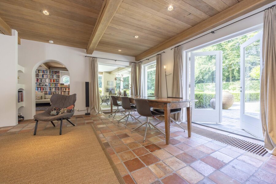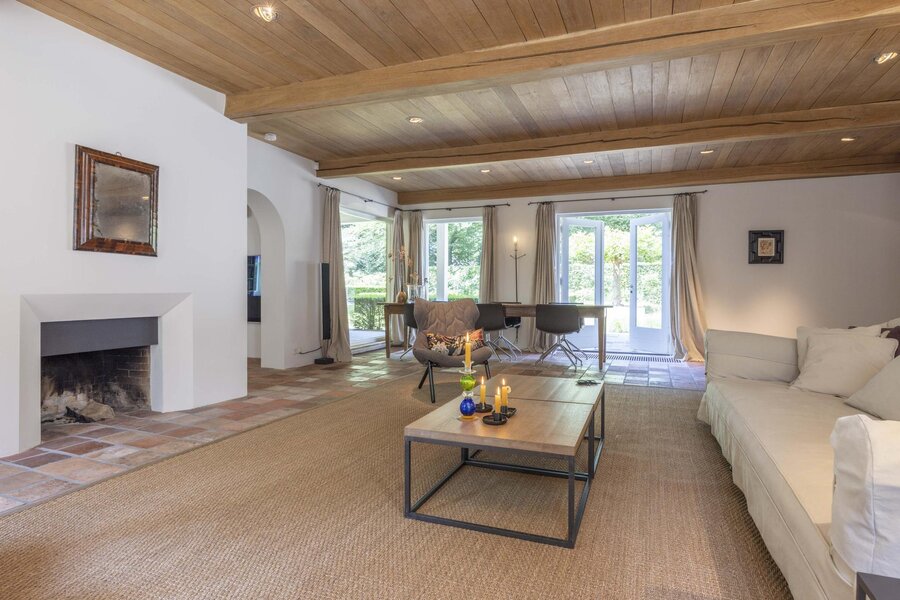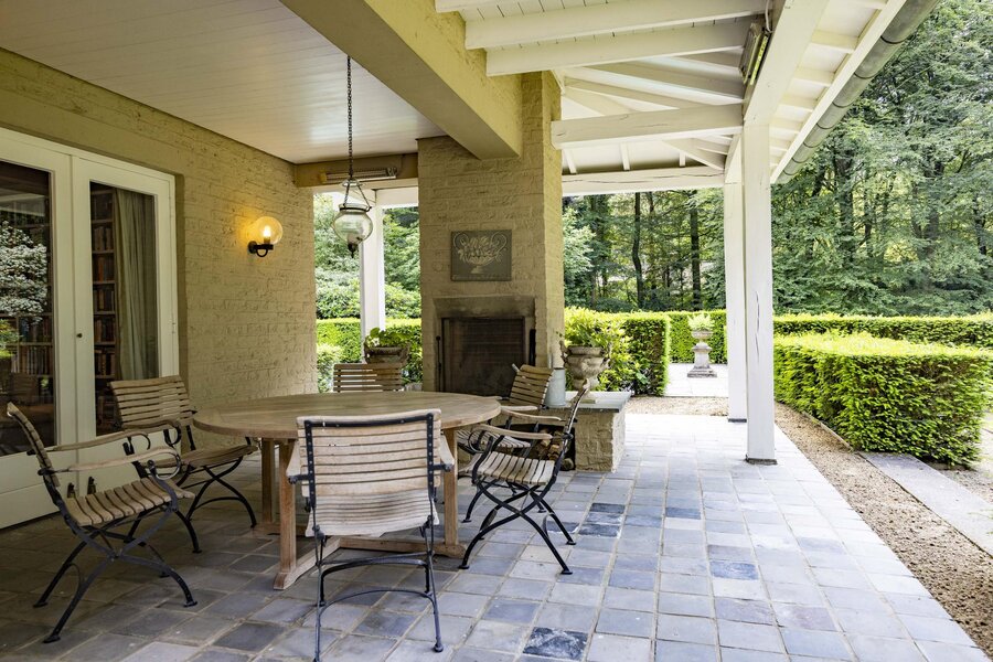 De raampartijen zorgen voor een aangename lichtinval en bieden een panoramisch zicht op de tuin en de groene omgeving. In de living zijn openslaande deuren naar het overdekte terras met terrasverwarming en buitenhaard; door de beschutte ligging kunt u hier in meerdere seizoenen heerlijk genieten.