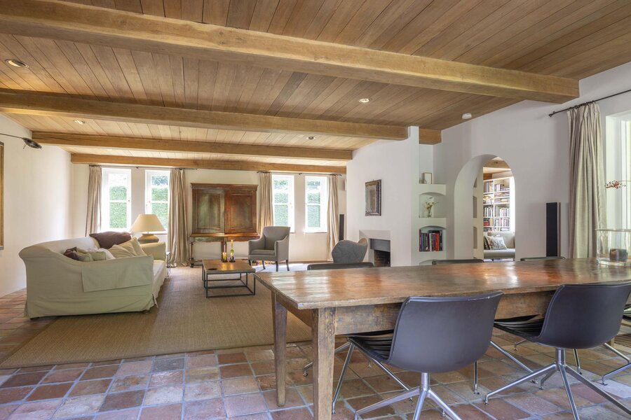 De lichte living is -middels een schouw met nissen- verdeeld in twee zitgedeeltes. Eén gedeelte is momenteel ingericht als T.V.- en leesruimte en heeft een vaste (boeken)kastwand. De terracotta tegelvloer, houten balkenplafond en de twee houtgestookte haarden geven het geheel een sfeervolle uitstraling.