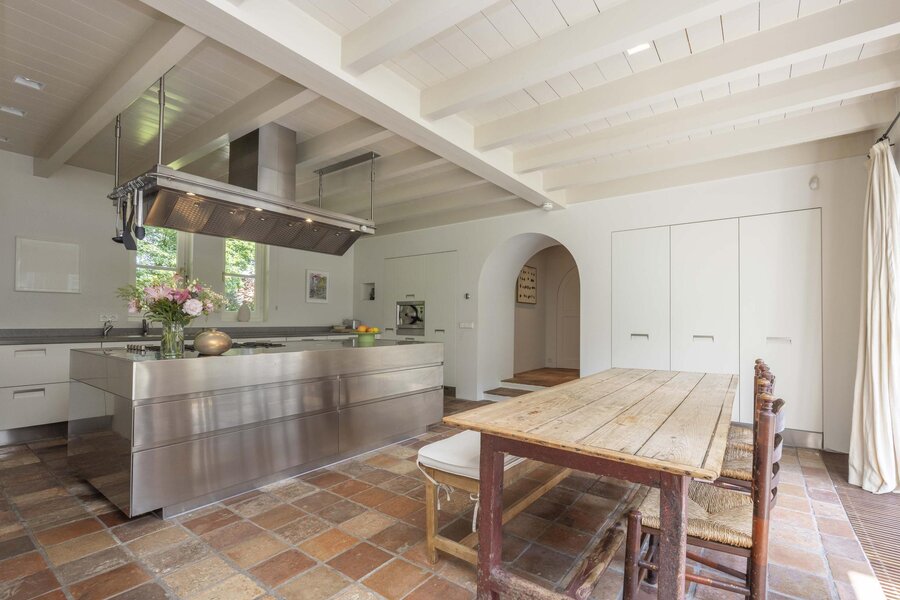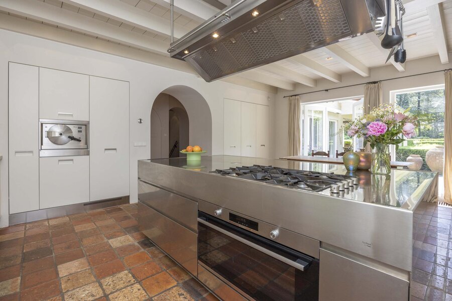 De woonkeuken heeft een luxe, moderne, rvs inrichting (Arclinea) met wandopstelling en een kookeiland met 5-pits gaskookplaat (incl. wokbrander) , professionele afzuigunit en kokend waterkraan. Verder eersteklas inbouwapparatuur: stoomoven, oven, 2 vaatwassers en een koelkast. Er is voldoende proviand- en bergruimte in de diverse lades en (wand)kasten.