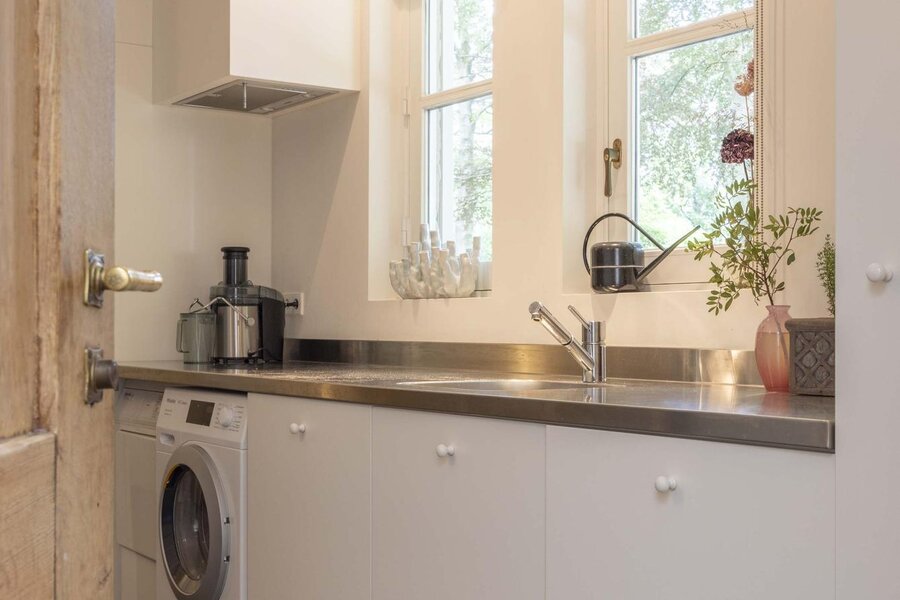 De tweede hal heeft een maatwerk wandkast met veel praktische bergruimte en garderobe. In de bijkeuken is een keukenopstelling met spoelbak en afzuigunit aanwezig, verder aansluitingen voor was- en droogapparatuur en een kastenwand voor extra bergruimte. Een loopdeur geeft toegang tot de carport.