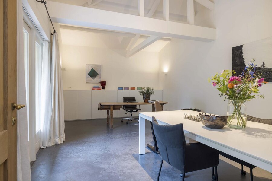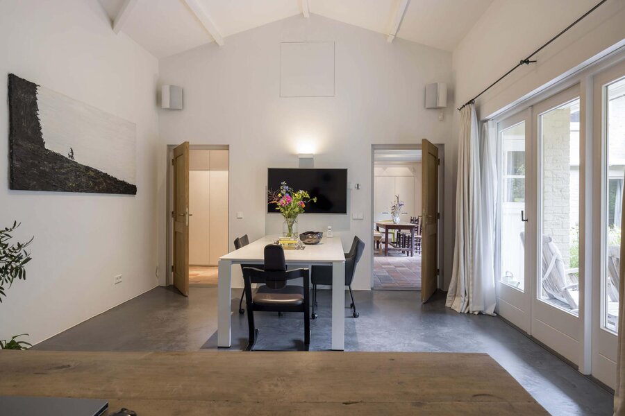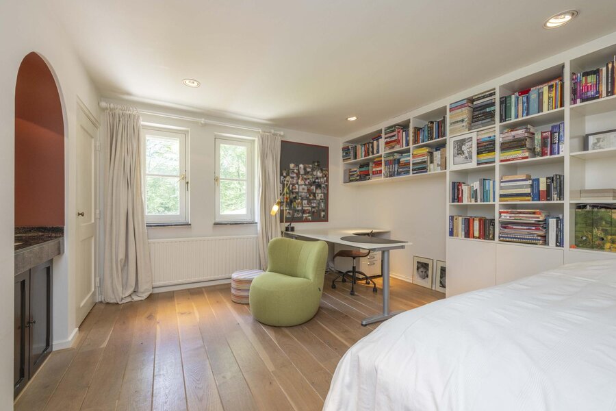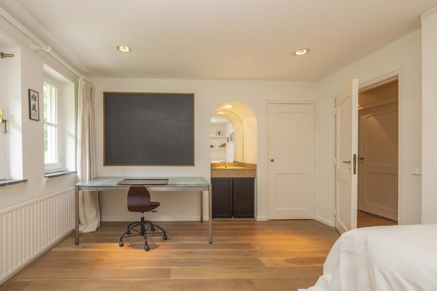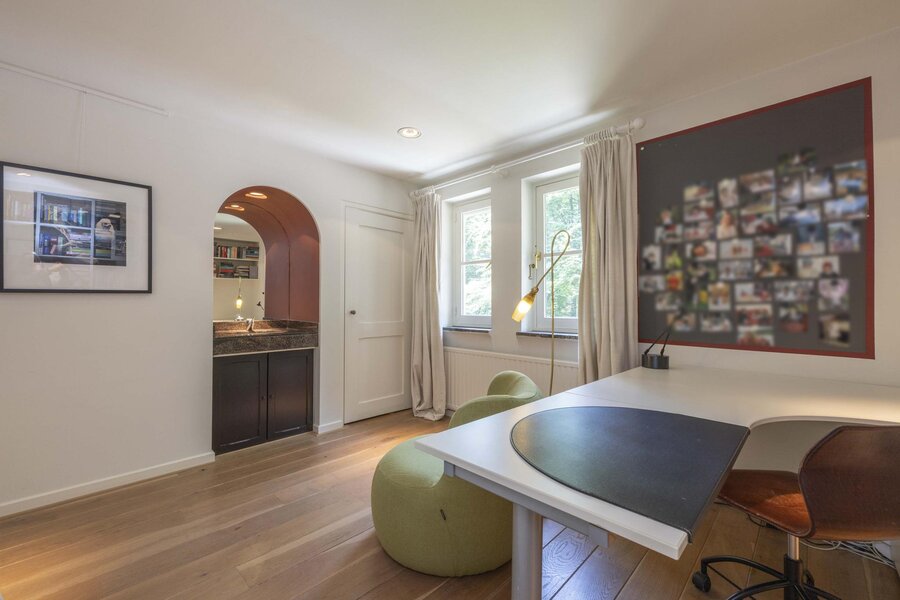 De lichte kantoor-/studeerkamer heeft een ruimtelijk karakter door de gebinten die in het zicht zijn gebleven; openslaande deuren naar het terras en de tuin. Aansluitend is er nog een badkamer met inloopdouche, wandcloset en fontein, het is dus eenvoudig mogelijk om nog een (extra) slaapkamer op de begane grond in te richten.