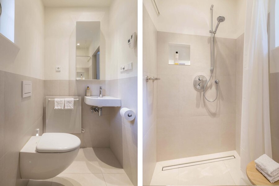 De toiletruimte is voorzien van een wandcloset en een plateau met waskom; er is een raam voor natuurlijke ventilatie.