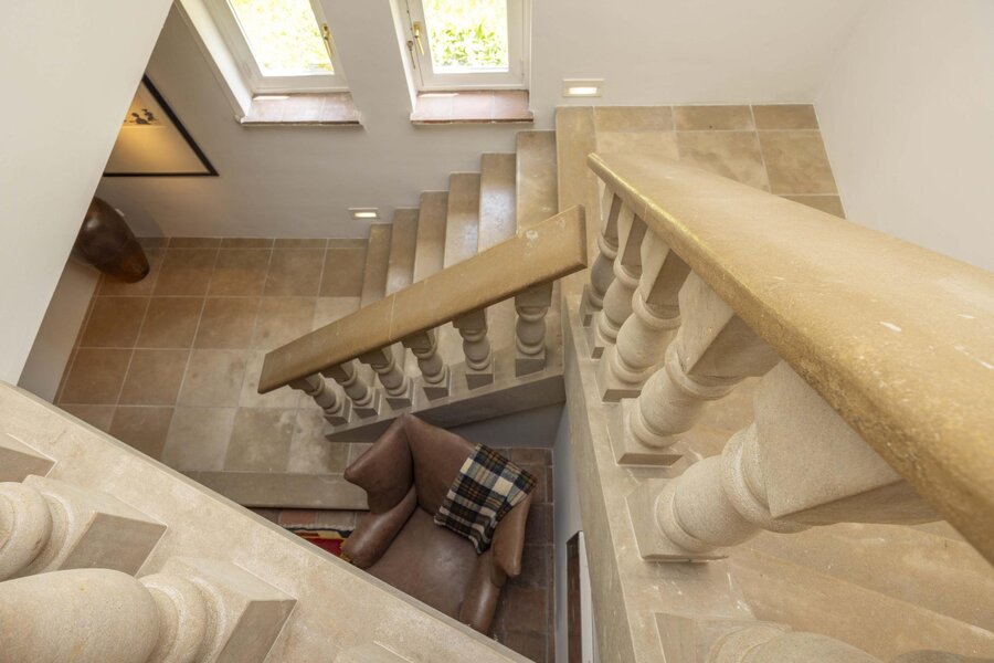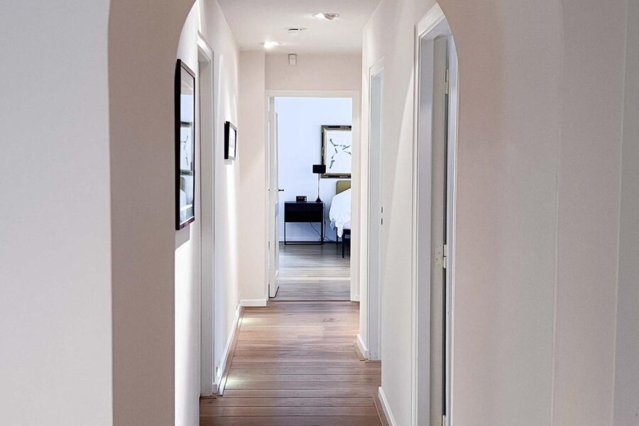 Overloop met toegang tot vijf slaapkamers, twee badkamers en toiletruimte.