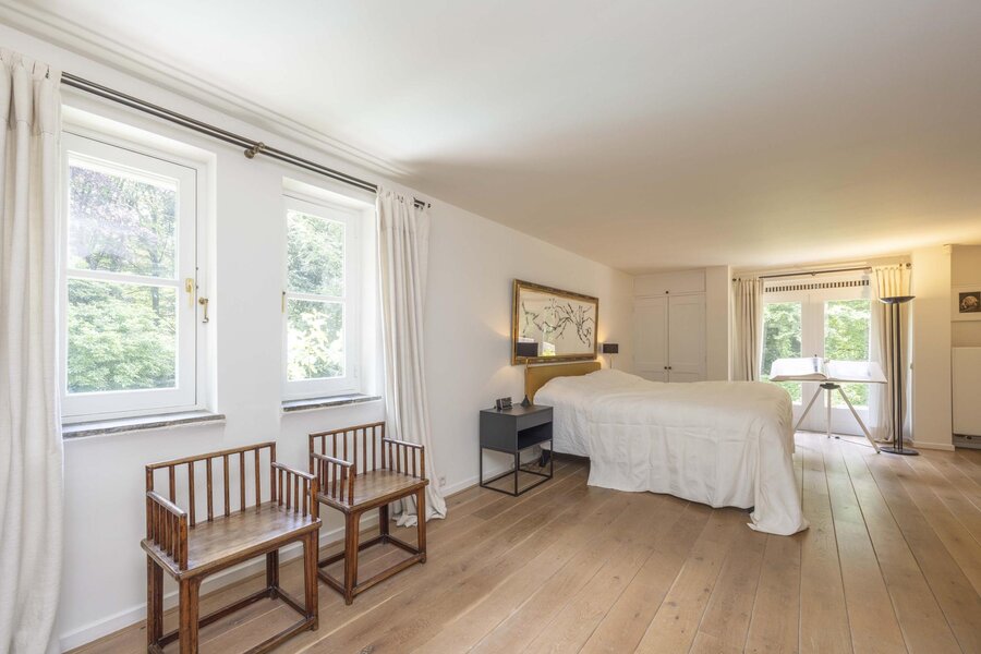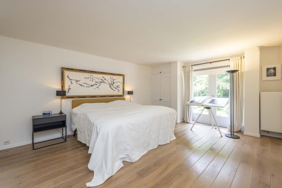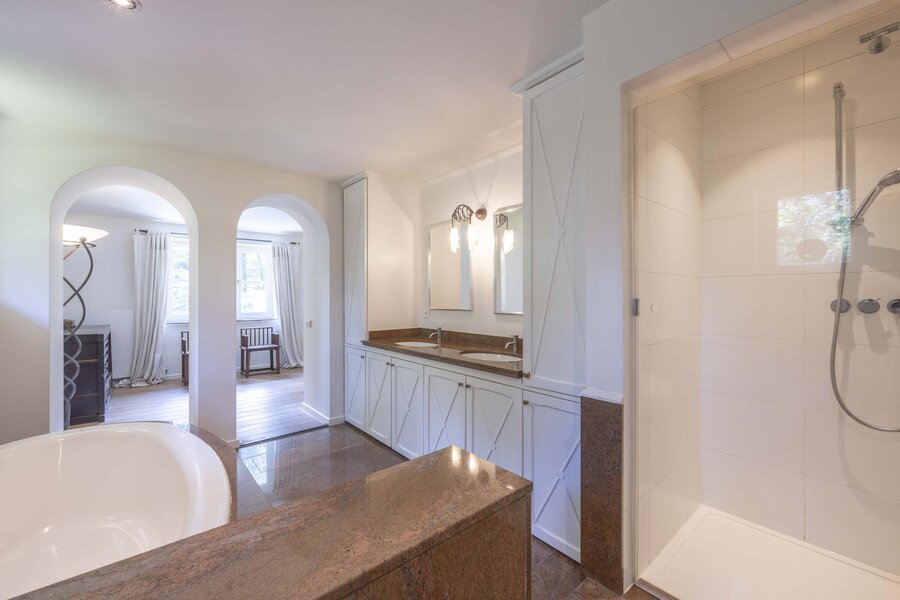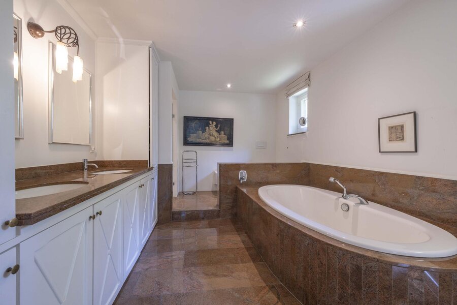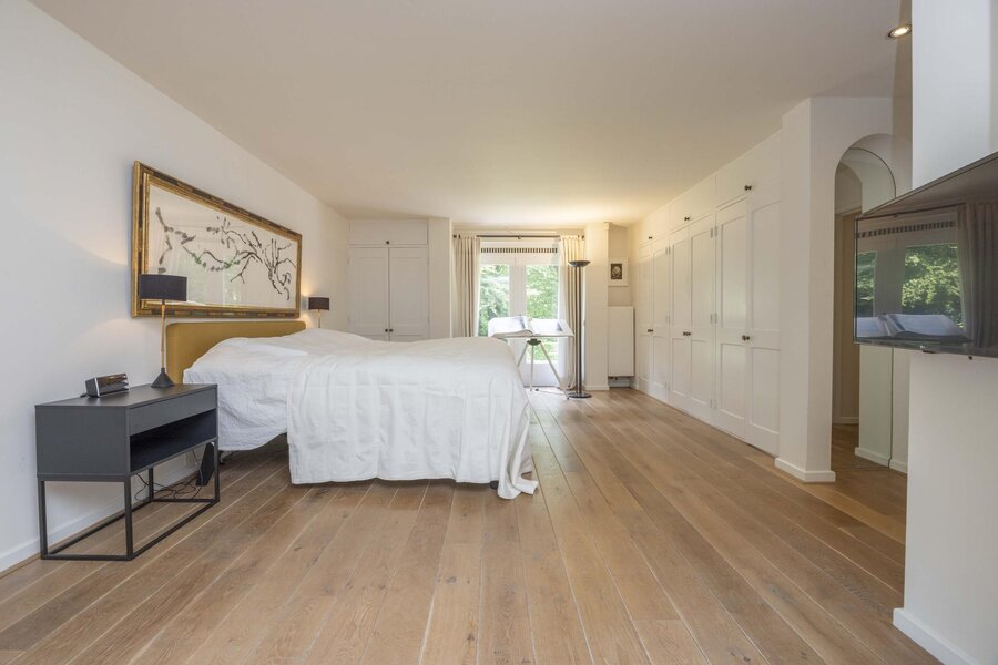 De masterbedroom heeft maatwerk garderobekasten, openslaande deuren naar een balkon en t.v.-aansluiting. De luxe badkamer en-suite beschikt over een ovalen ligbad, inloopdouche, twee wastafels in wandmeubel, designradiator, wandcloset en bidet.