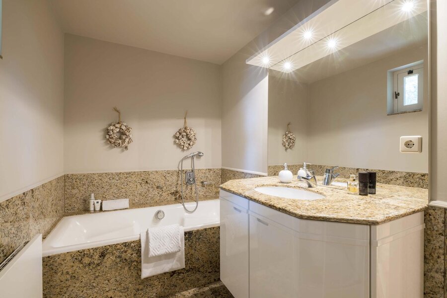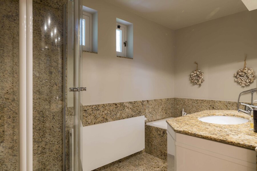 De tweede badkamer op de verdieping is voorzien van een ligbad, douchecabine en wastafel met wandmeubel. Tevens nog een separate toiletruimte met wandcloset en fontein.