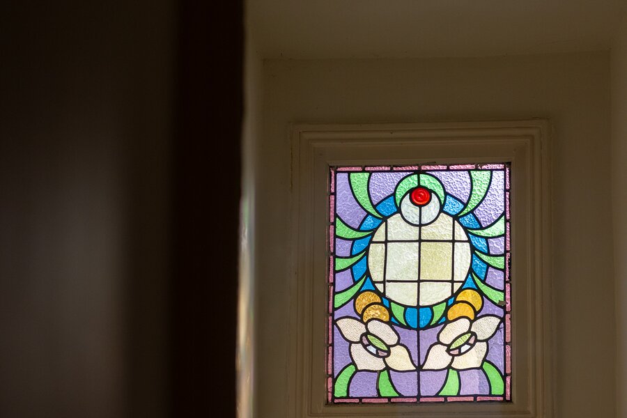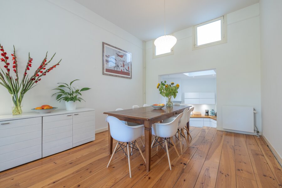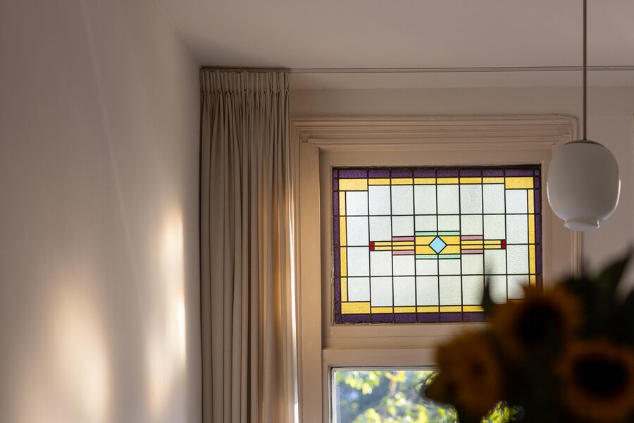 Via de statige dubbele voordeuren betreed je de ruime hal, waar originele elementen zoals paneeldeuren, een tussenhal met glas-in-loodramen en een fonteintje bewaard zijn gebleven. Vanuit de hal heb je toegang tot de royale woonkamer aan de voorzijde, waar de hoge plafonds (3.40 m), grote ramen en een schouw met gashaard direct de aandacht trekken. Aan de achterzijde ligt het eetgedeelte, met een lagergelegen open keuken die bereikbaar is via een klein trapje. De moderne keuken is voorzien van een lichtkoepel, houten werkblad en hoogwaardige inbouwapparatuur.