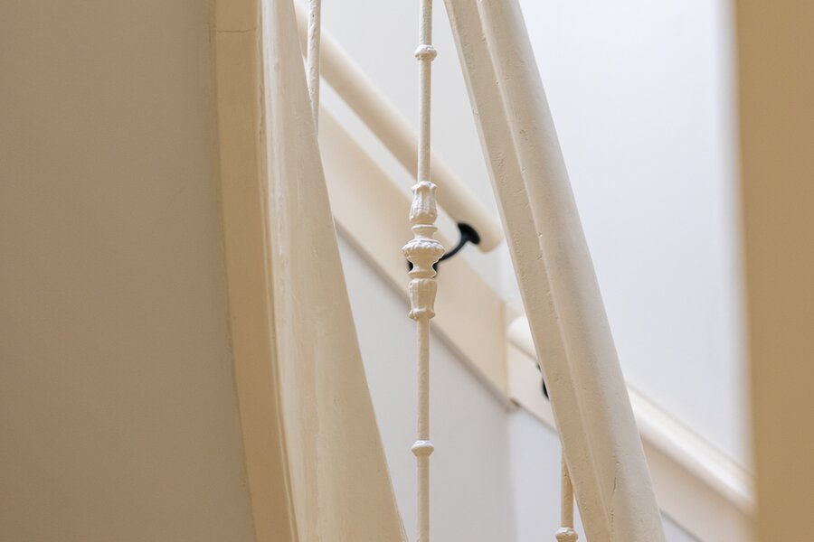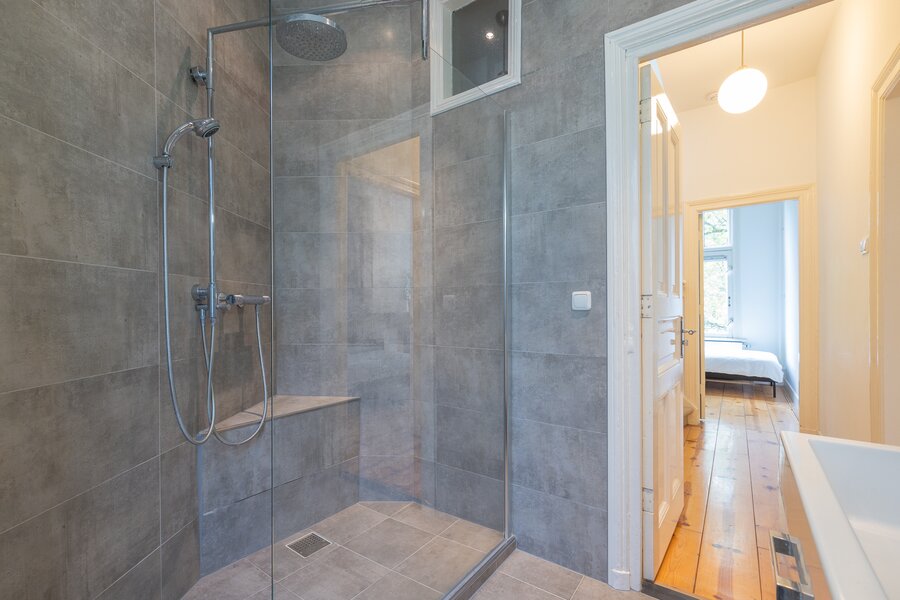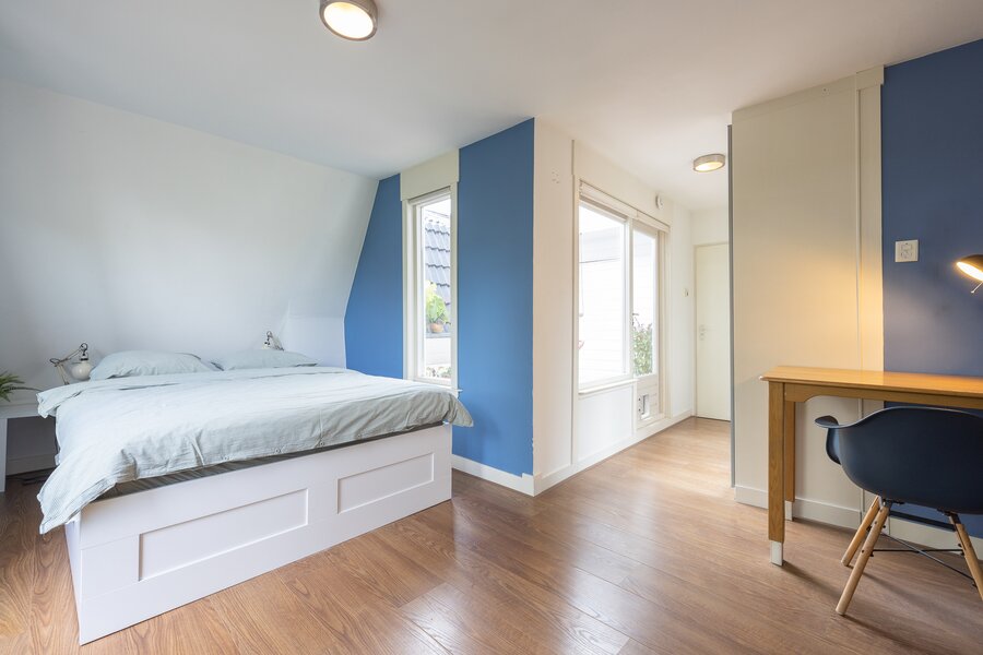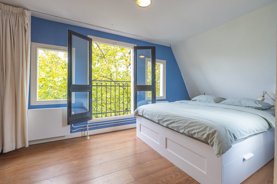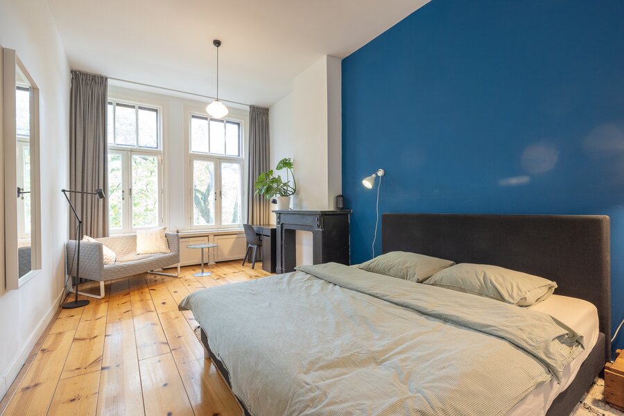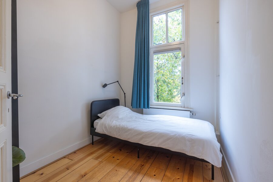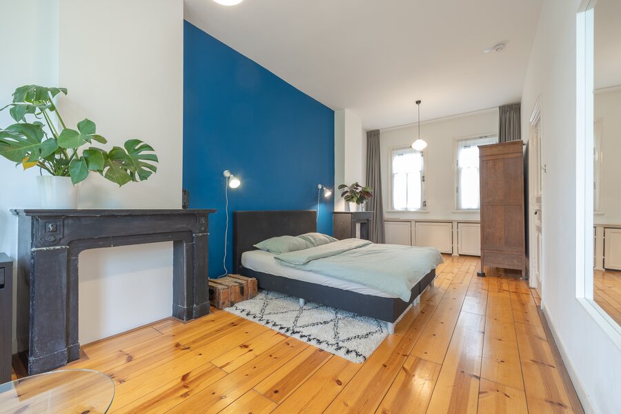 Op de eerste verdieping bevinden zich twee ruime slaapkamers en een moderne badkamer. De indrukwekkende hoofdslaapkamer is meer dan 8,30 meter diep en heeft lichtinval aan zowel de voor- als achterzijde. De kamer is sfeervol dankzij de originele schouwen en biedt voldoende ruimte voor een werkplek. De tweede slaapkamer is ingericht als kinderkamer. De badkamer is modern afgewerkt en beschikt over een ruime inloopdouche, breed wastafelmeubel en designradiator. Op de overloop is een aparte toiletruimte.