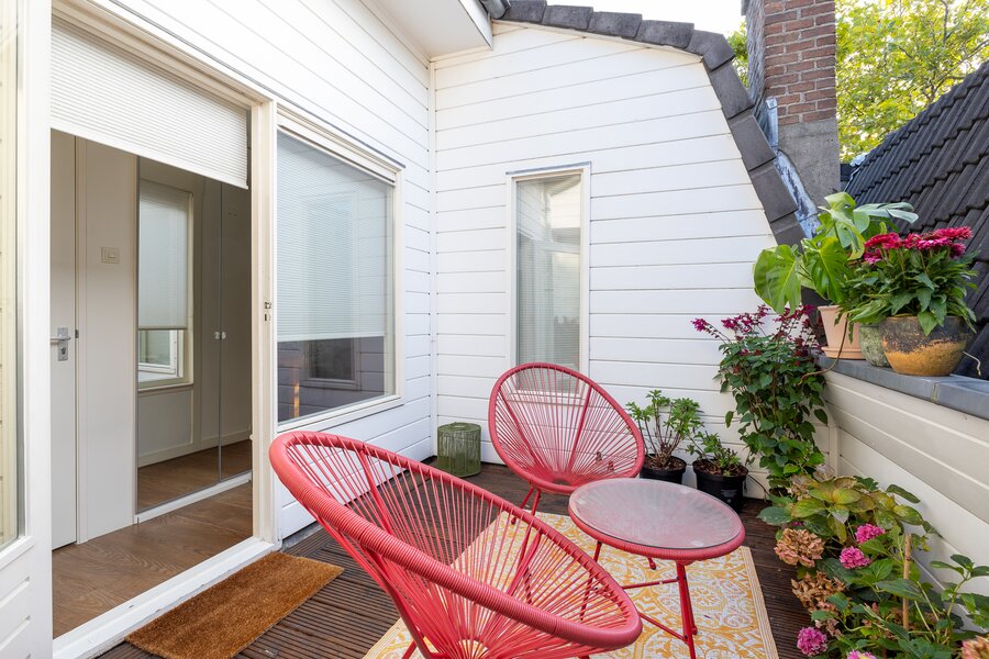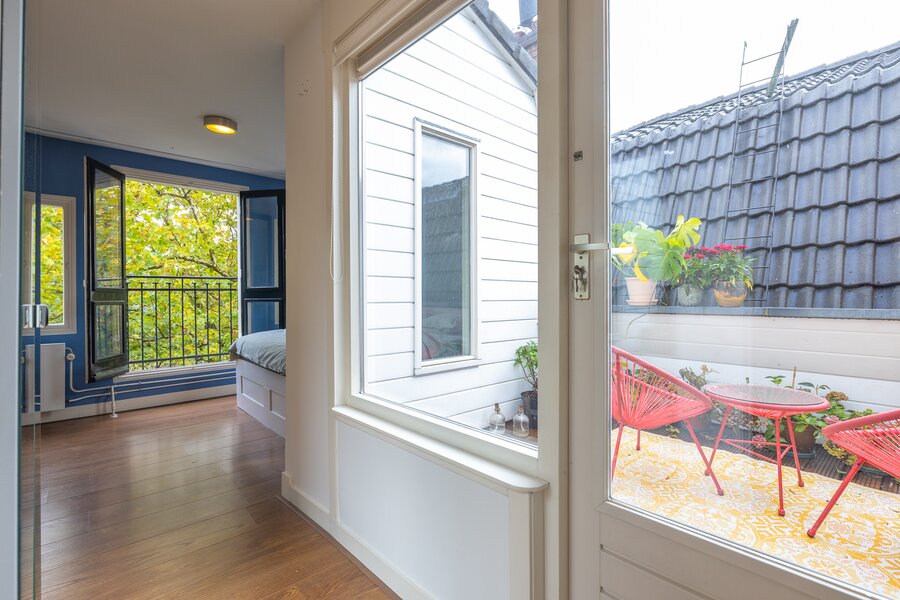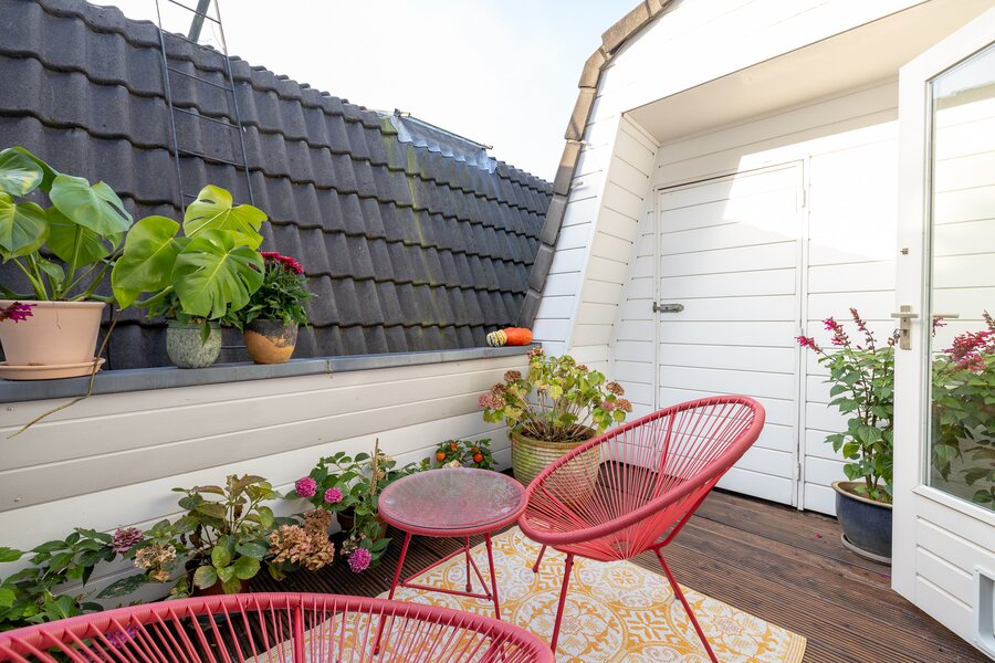 Het dakterras op de tweede verdieping is een van de hoogtepunten van het huis. Gelegen op het zuiden en volledig beschut, is dit een heerlijke plek om te ontspannen en van de zon te genieten. De hardhouten vloer en houten omheining geven het terras een warme en knusse sfeer.