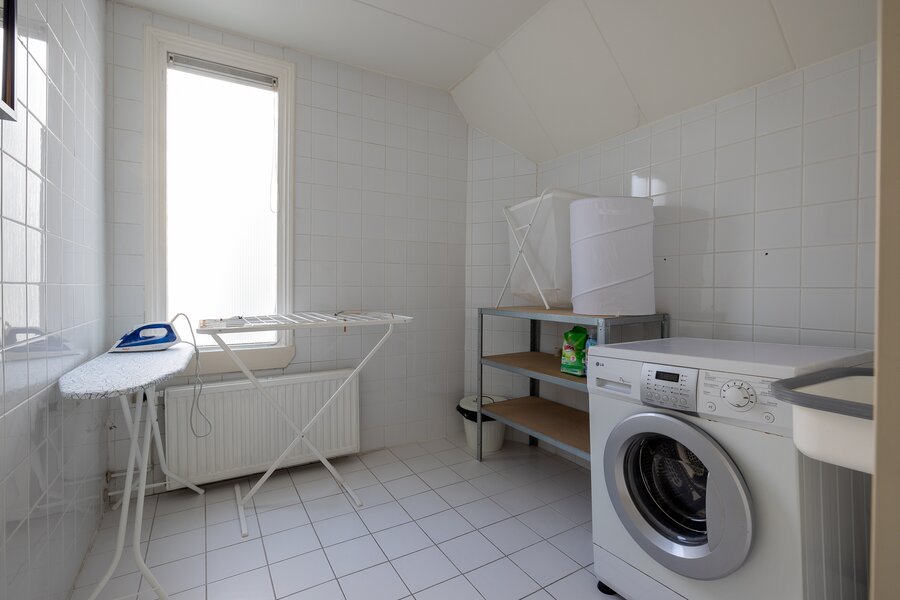 De tweede verdieping biedt een derde slaapkamer, met charmante schuine dakvlakken, een Frans balkon met openslaande deuren en toegang tot het zonnige dakterras. Dit terras, gelegen op het zuiden, biedt volledige privacy en is beschut genoeg om het hele jaar door van te genieten. Verder zijn er een berging en een aparte wasruimte met aansluitingen voor wasmachine en droger. Deze verdieping biedt tevens de mogelijkheid om een extra keuken te realiseren, waardoor dubbele bewoning of splitsing eenvoudig te realiseren is.