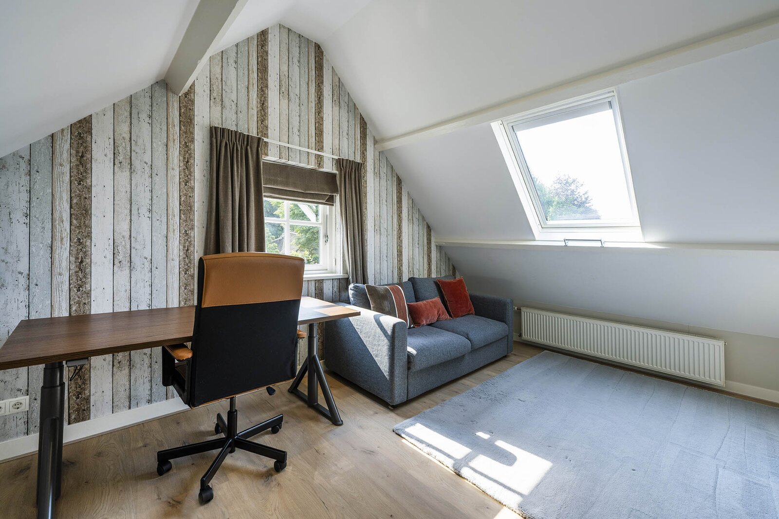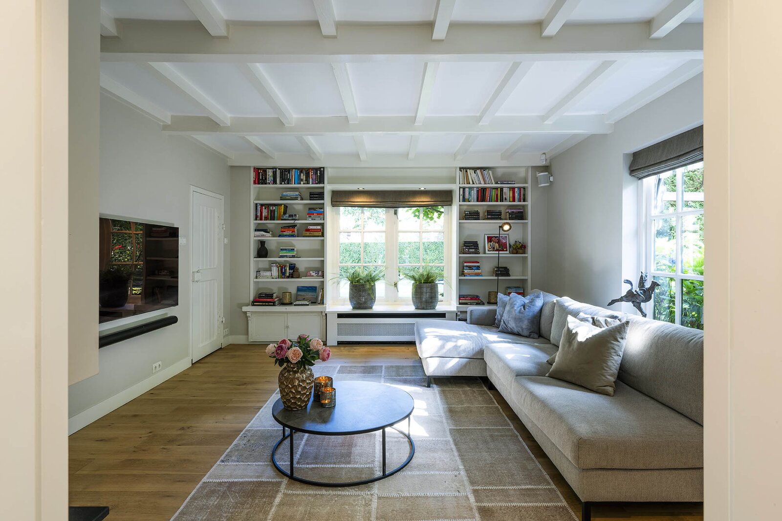Bij binnenkomst valt direct de royale centrale hal op, met een statig trappenhuis, garderobe en een gastentoilet. Vanuit hier zijn alle vertrekken bereikbaar. De studeer-/TV kamer, voorzien van open haard, grenst aan de woonkamer en kan naar wens open of afgesloten gebruikt worden. De ruime en sfeervolle woonkamer met eikenhouten vloer biedt een prachtig uitzicht op de zonnige tuin. Dubbele openslaande deuren verbinden het binnenleven met het buitenterras, waardoor binnen en buiten naadloos in elkaar overlopen.