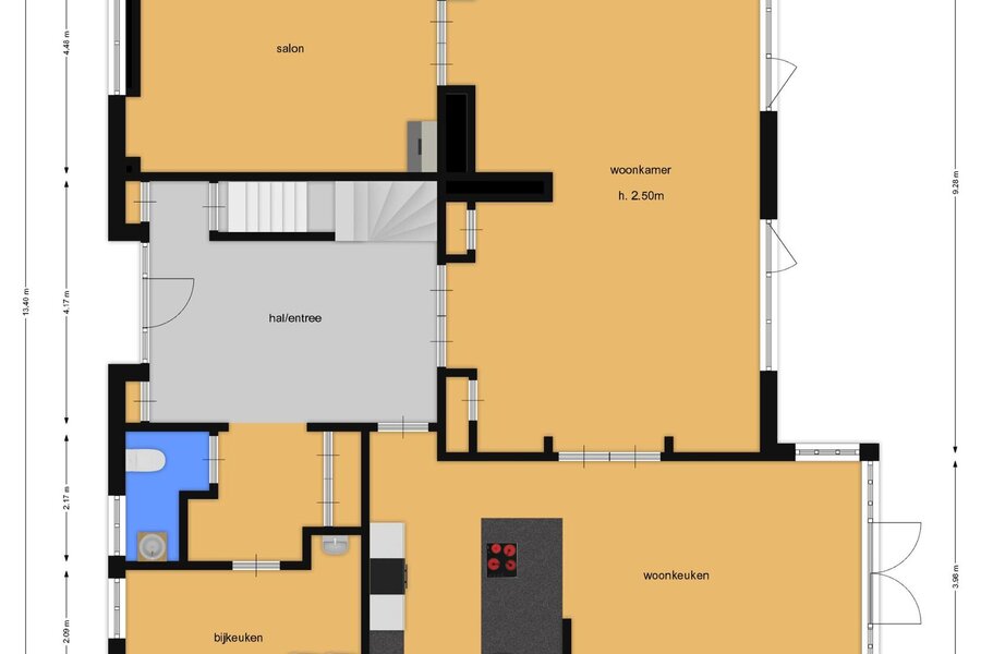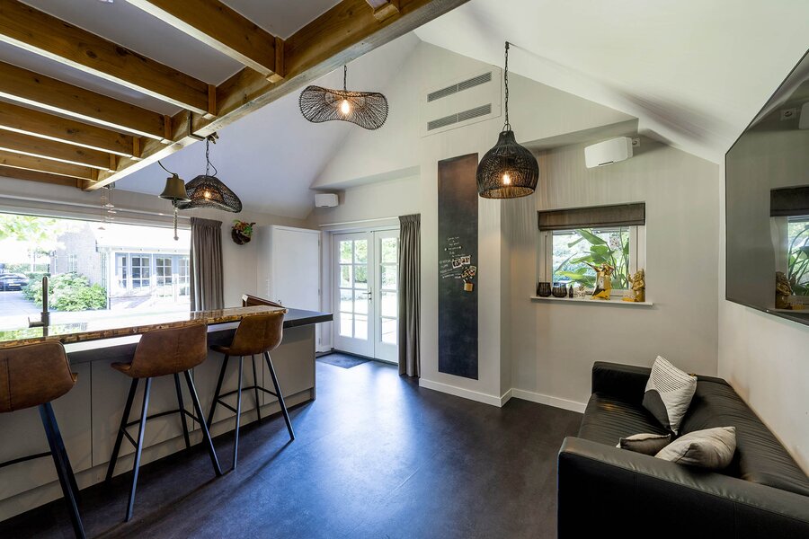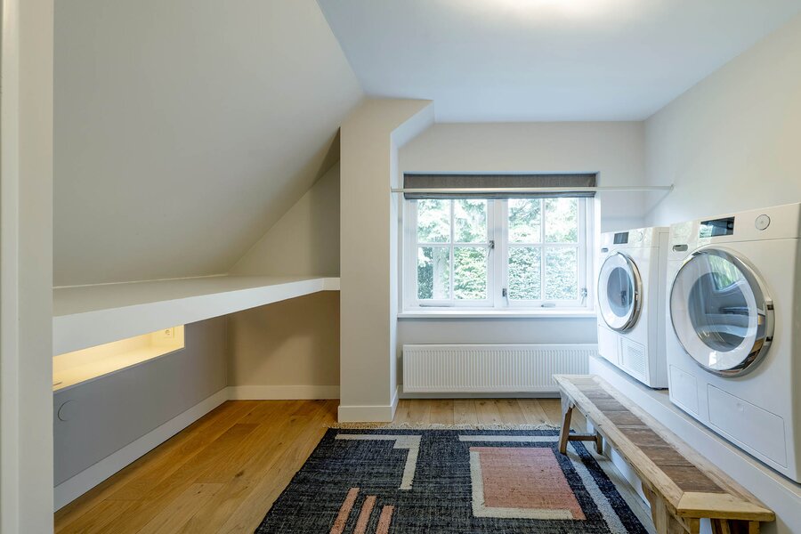 De ruime woon-/eetkeuken, eveneens met openslaande deuren naar het terras en de tuin, vormt het hart van de woning. Deze moderne keuken is voorzien van hoogwaardige inbouwapparatuur en nodigt direct uit tot culinaire avonden met familie en vrienden. Via de centrale hal bereikt u tevens de bijkeuken met veel kastruimte en een praktische zijingang.