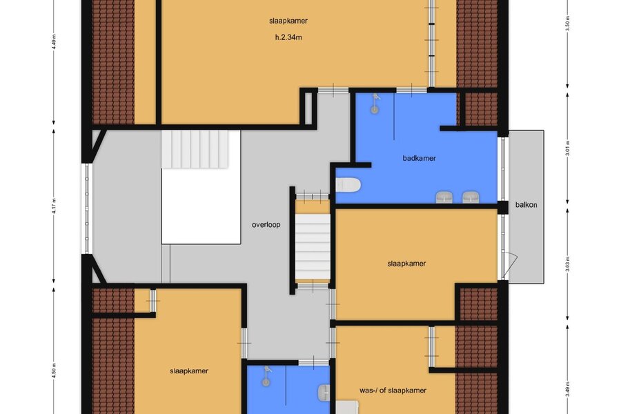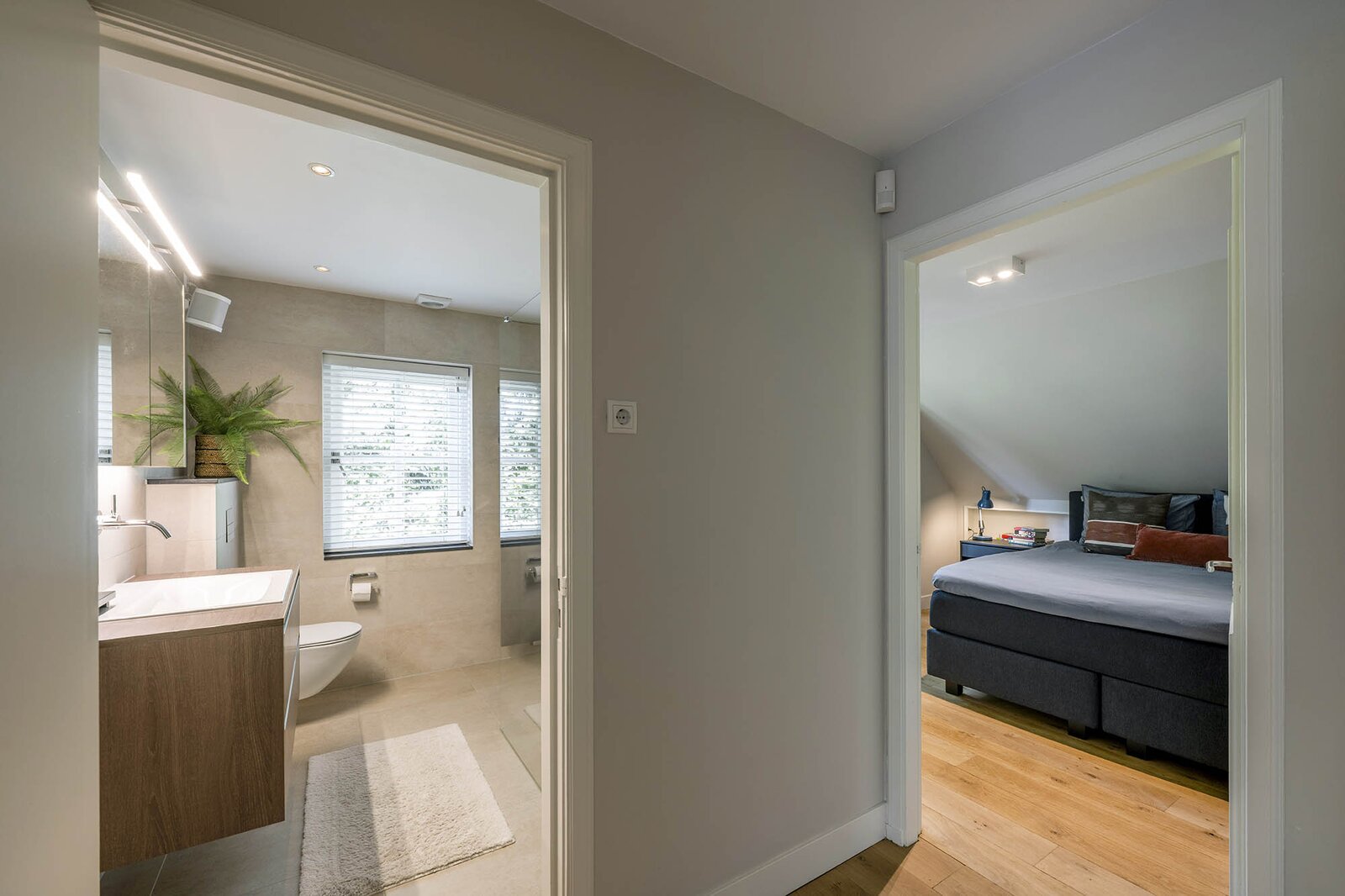 De imposante trapopgang leidt naar een royale overloop met vide, die voor een ruimtelijk effect zorgt. Deze verdieping beschikt over vier slaapkamers, allen voorzien van vaste kasten. De masterbedroom beschikt bovendien over een eigen inloopkast, een tweede kleedruimte en een luxe en-suite badkamer met dubbele wastafel, inloopdouche en toilet. Daarnaast zijn er twee ruime slaapkamers, waarvan één toegang biedt tot het balkon. Een vierde kamer is in gebruik als waskamer maar kan eenvoudig dienstdoen als logeer- of slaapkamer. Voor de kinderen is er een tweede badkamer met inloopdouche, wastafel en toilet.