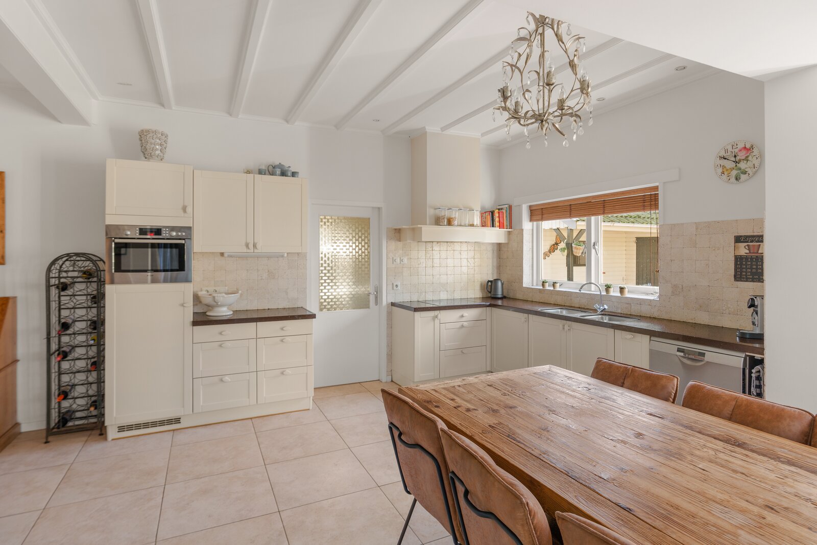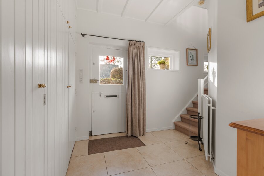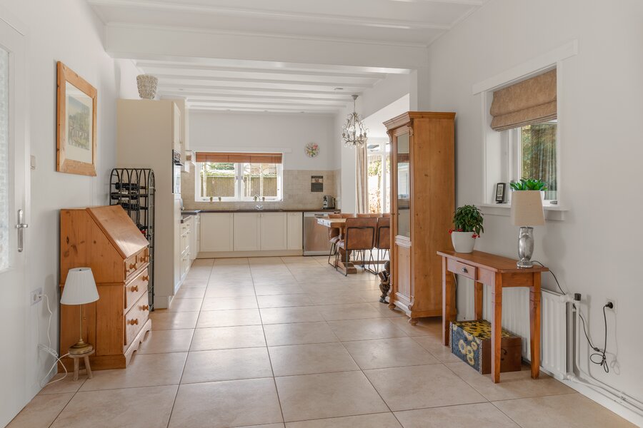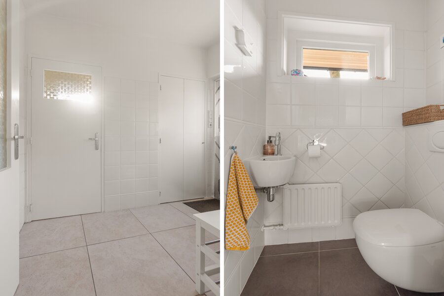 Via de achter-entree bereikt u een tweede ruime hal met vaste kast met aansluitingen voor wasapparatuur, een toiletruimte met fonteintje en een nette badkamer op de begane grond met wastafel en ligbad. Vanuit deze hal is eveneens de woonkeuken bereikbaar.