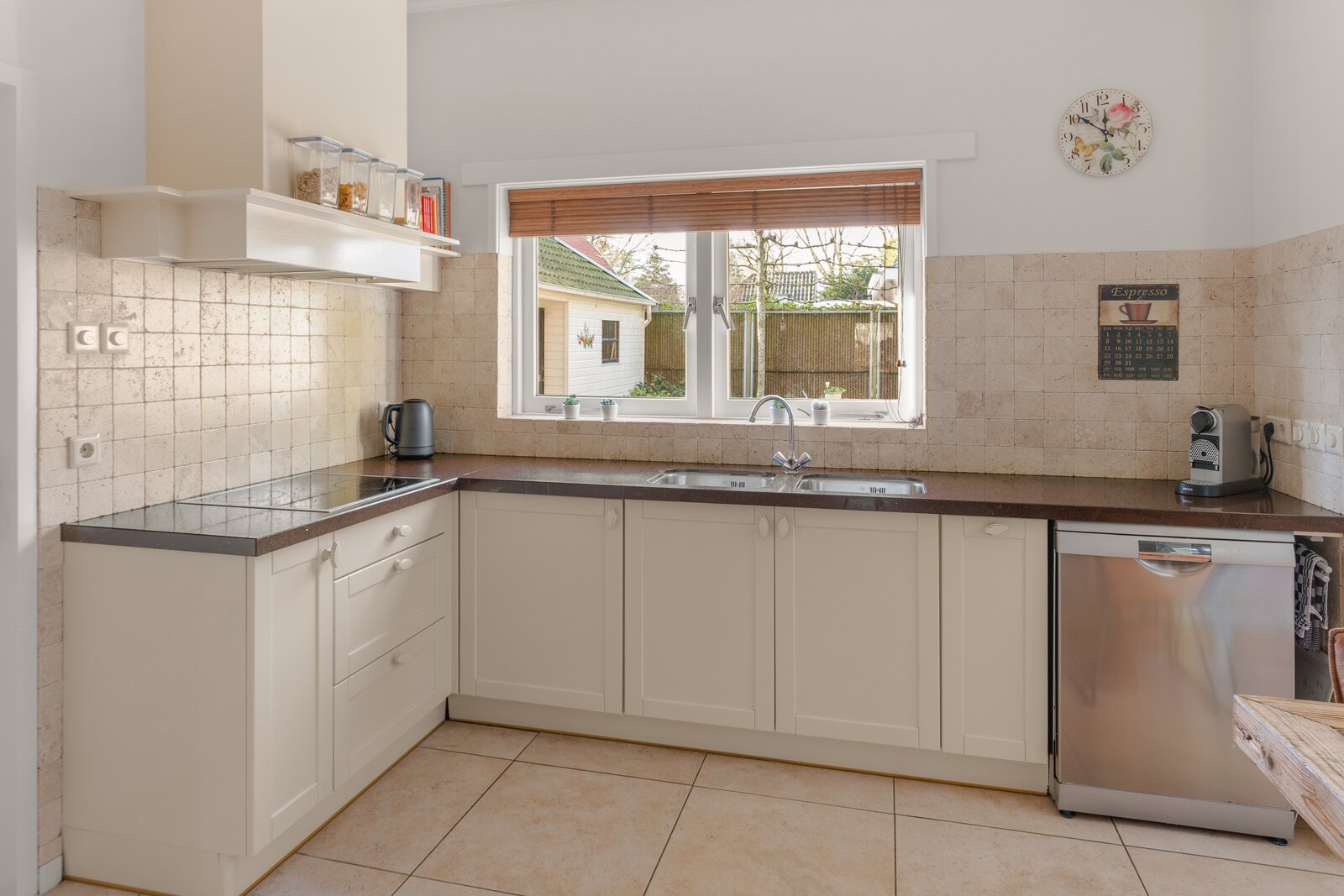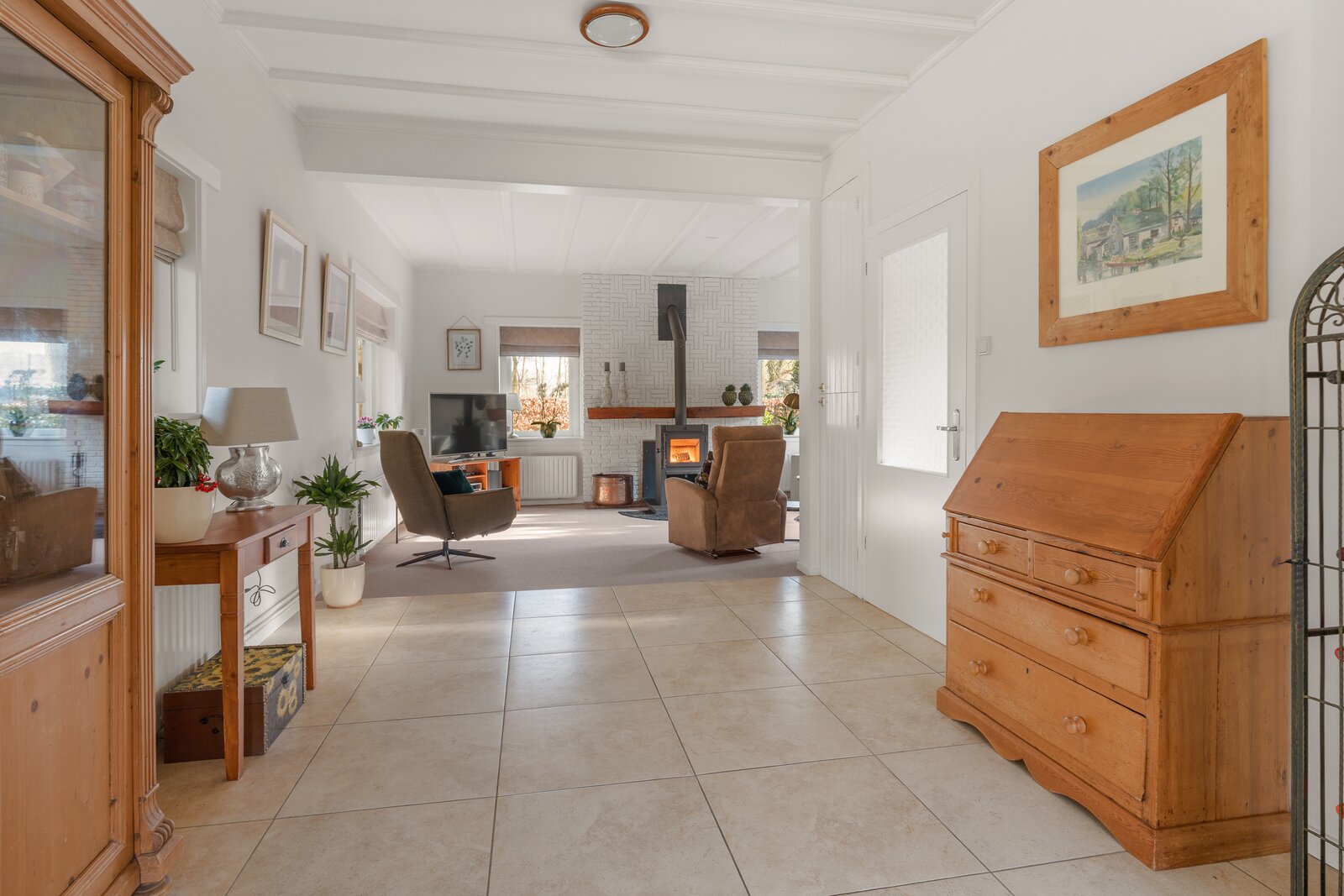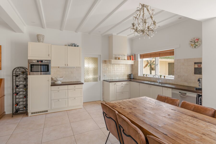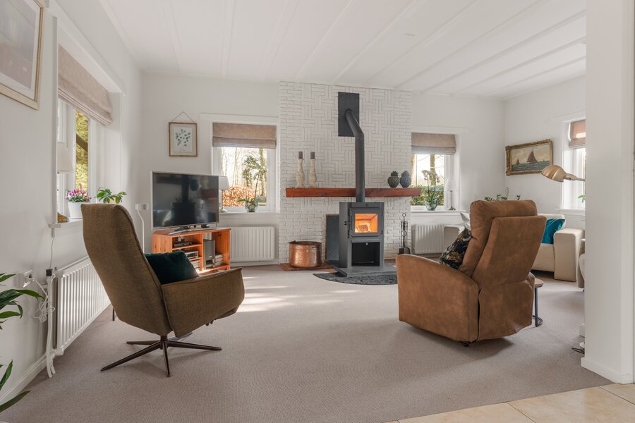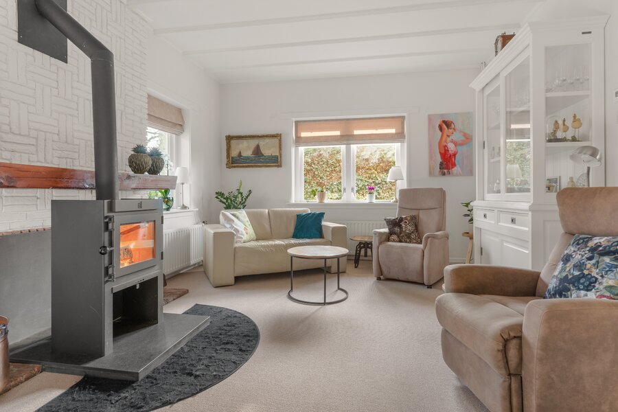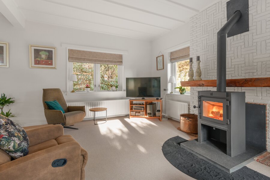 Begane grond: Entree met royale hal, voorzien van veel kastruimte en een karakteristieke bordestrap naar de verdieping. Aan de voorzijde van de woning bevindt zich de L-vormige woonkamer met houtkachel, die zorgt voor een warme en uitnodigende sfeer. Vanuit de woonkamer is er een doorloop naar de royale woonkeuken, uitgerust met diverse inbouwapparatuur, waaronder een combimagnetron, koelkast, vaatwasser en elektrische kookplaat. De openslaande deuren bieden direct toegang tot de zijtuin.