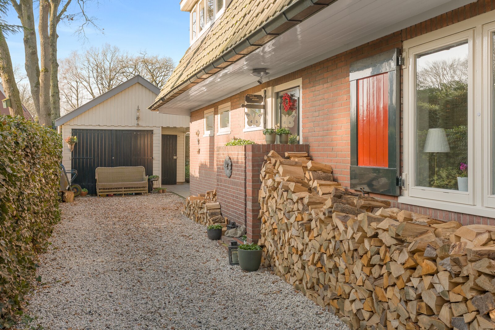 • Vrijstaande garage/berging van ca. 32 m² met overkapping.