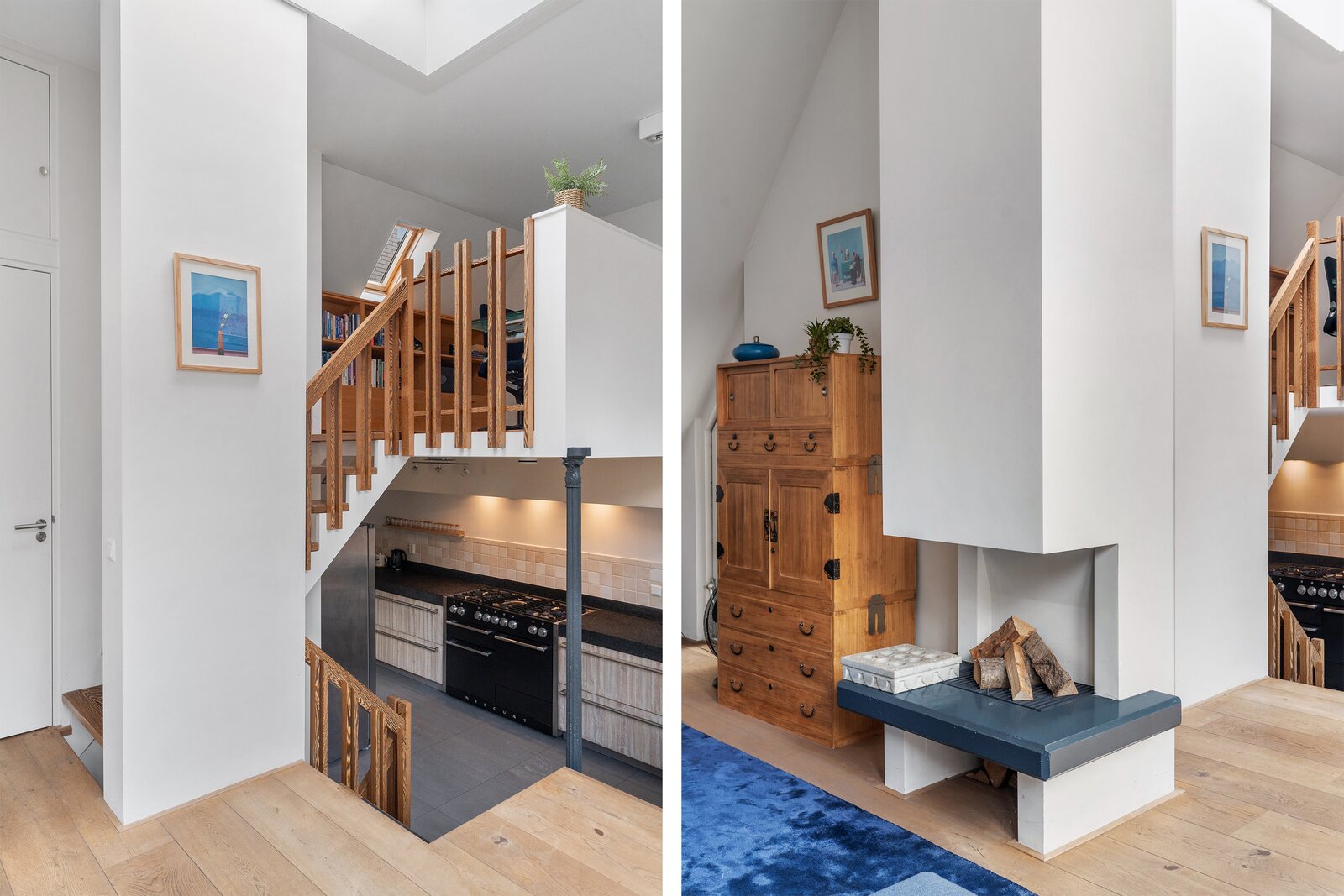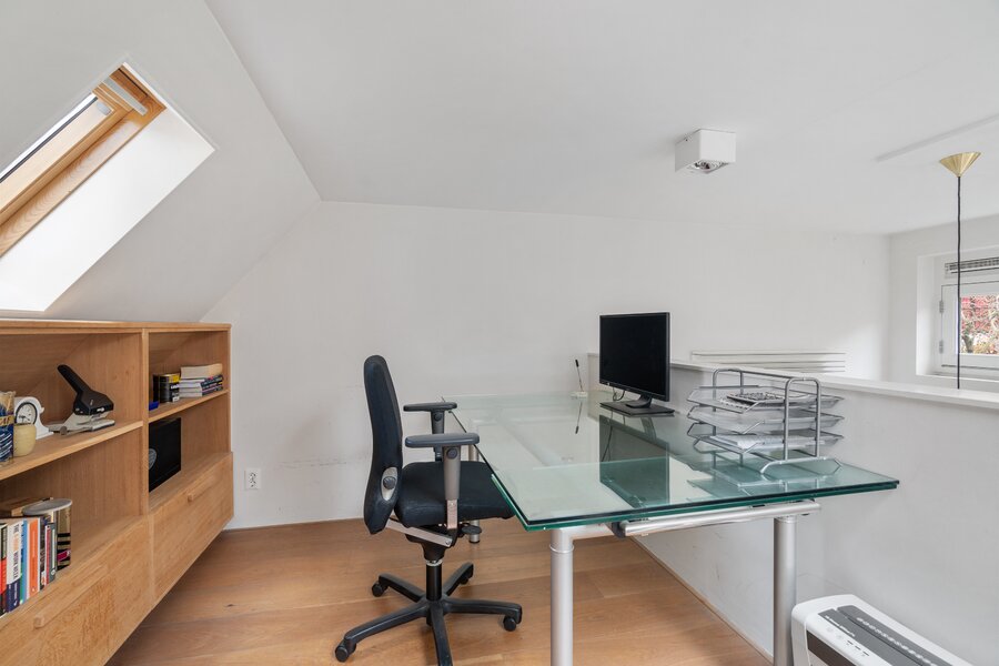 Lichte L-vormige woonkamer met open haard; separaat toilet met fontein; vliering in gebruik als werkkamer.