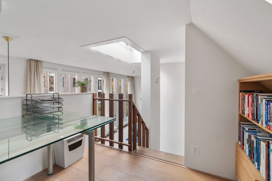 Het huis heeft een woonoppervlakte van maar liefst 178 m² en is gelegen op Eigen Grond. De indeling van de woning is speels en deels split-level. Zo is er op de begane grond o.a. een royale slaapkamer met een walk-in closet en een eigen badkamer. De riante woonkeuken en de loggia zijn op de bel-etage gelegen en vanuit de woonkeuken is er split level op de eerste etage de riante living. Door de hoge plafonds en de enorme glazen pui is de woonbeleving hier fantastisch. In de woonkamer zit een gezellige open haard en er is een extra vliering gerealiseerd, welke in gebruik is als werkkamer en uitzicht geeft over de woonkamer en de straat.
