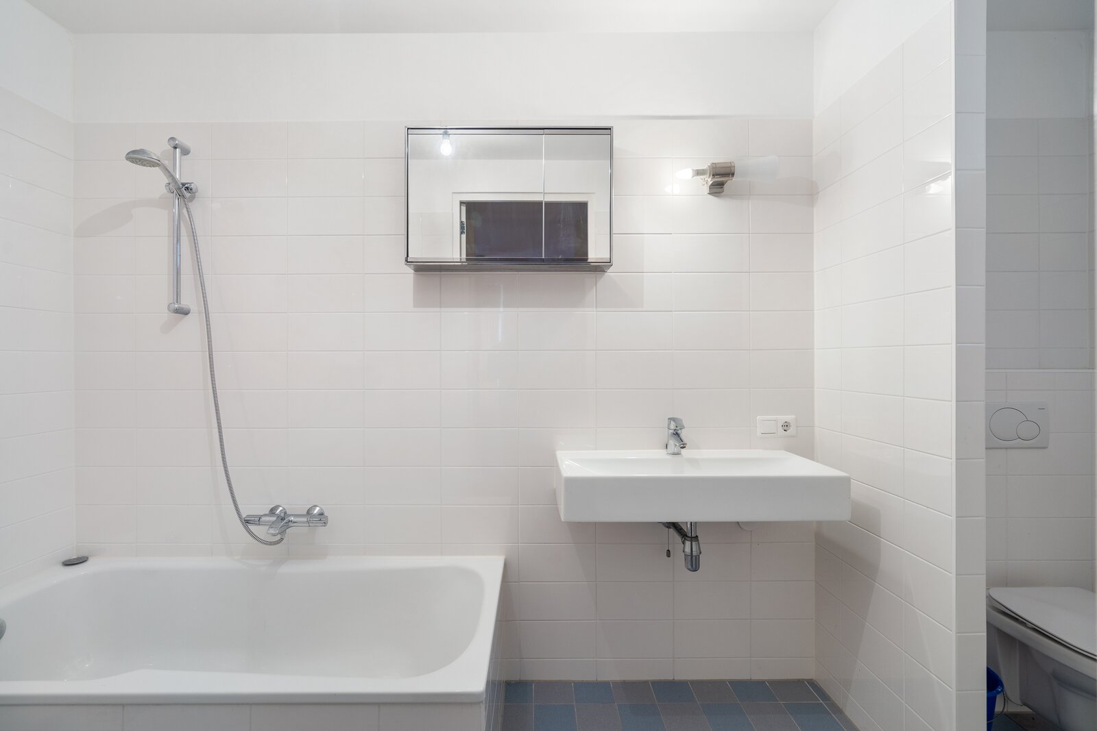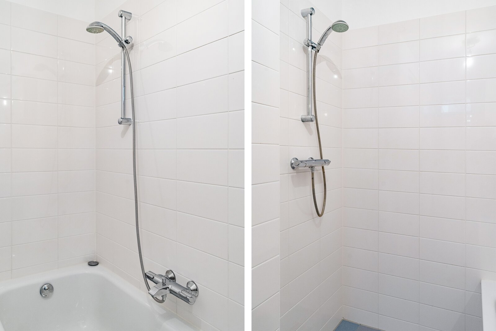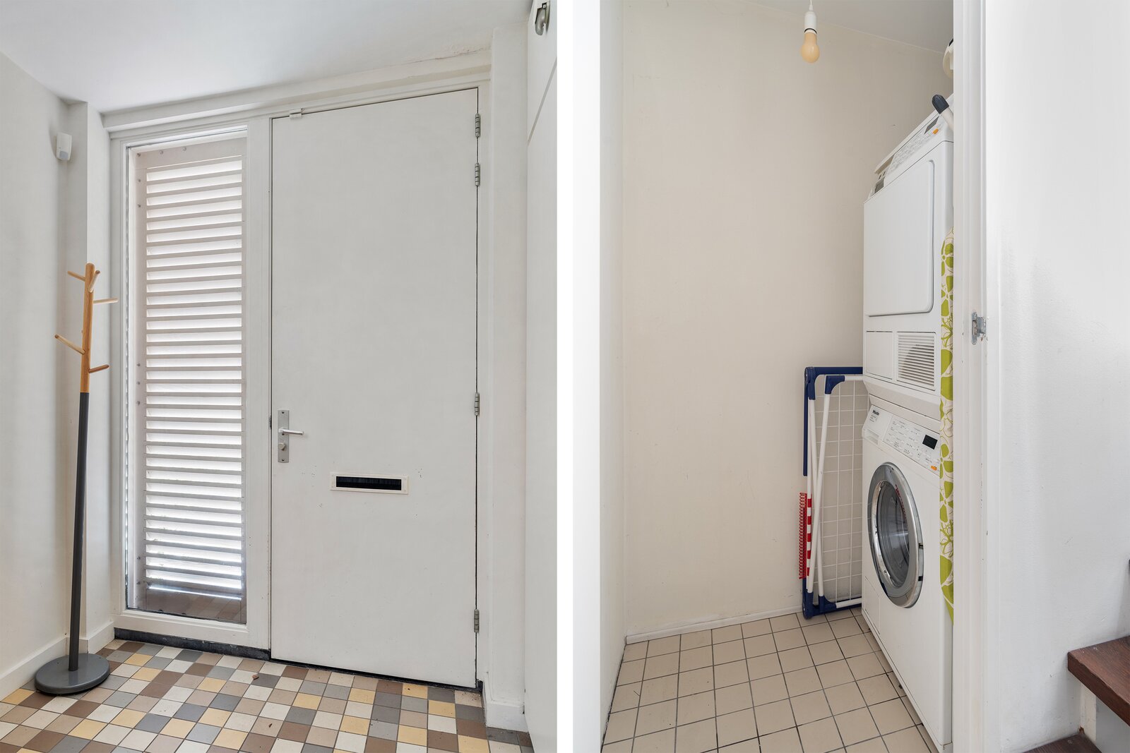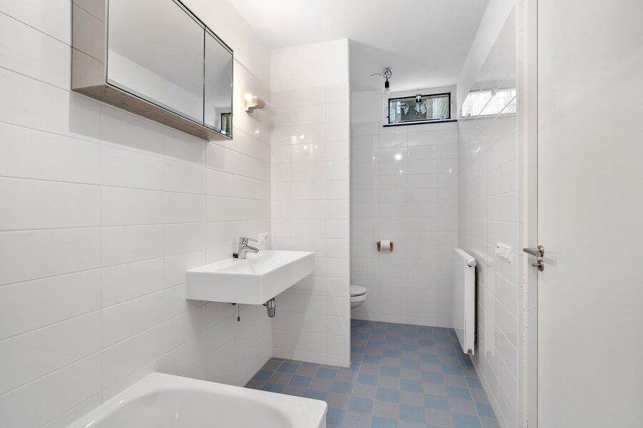 Entree van de woning; hal; meterkast; wasruimte met de wasmachine en droger aansluiting; royale slaapkamer met wal-in closet en toegang tot de badkamer met ligbad, douche, toilet en wastafelmeubel.