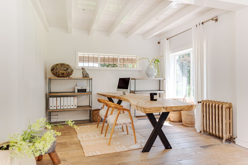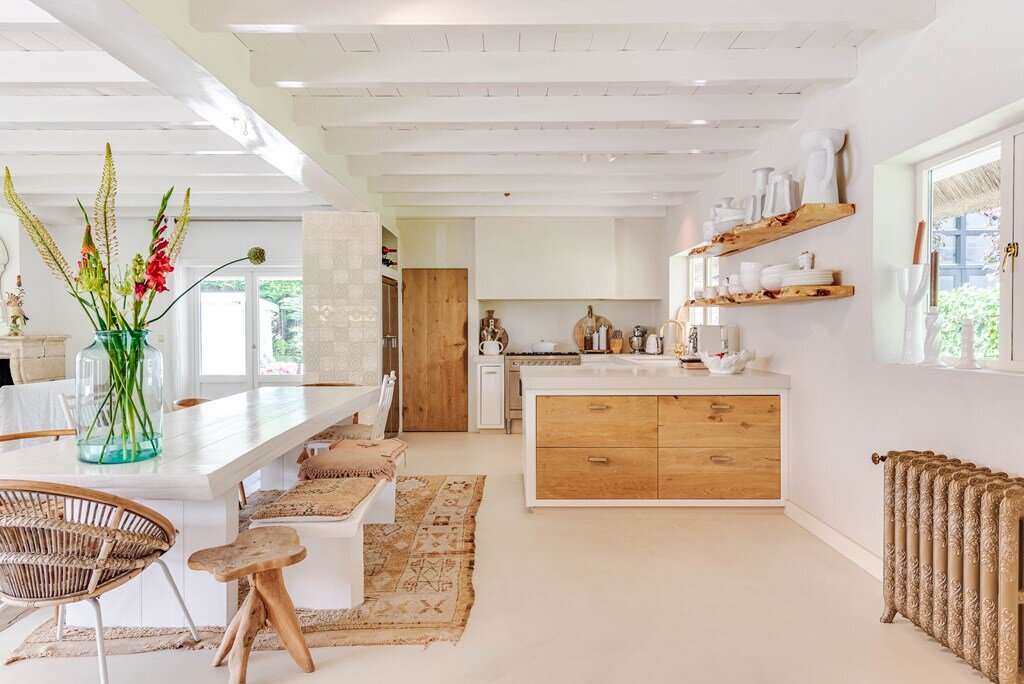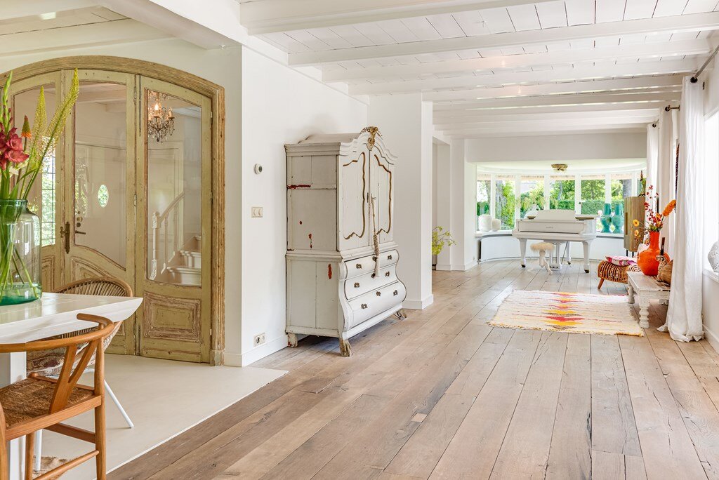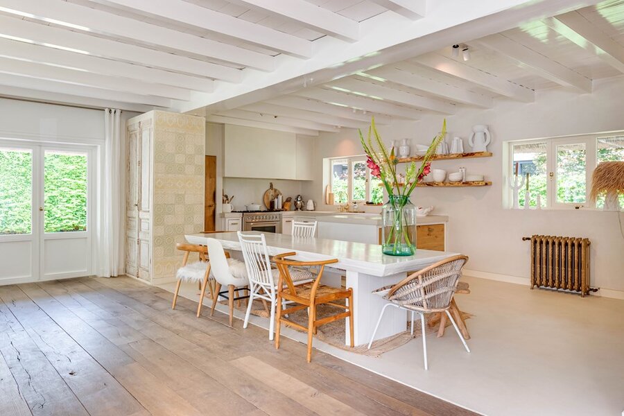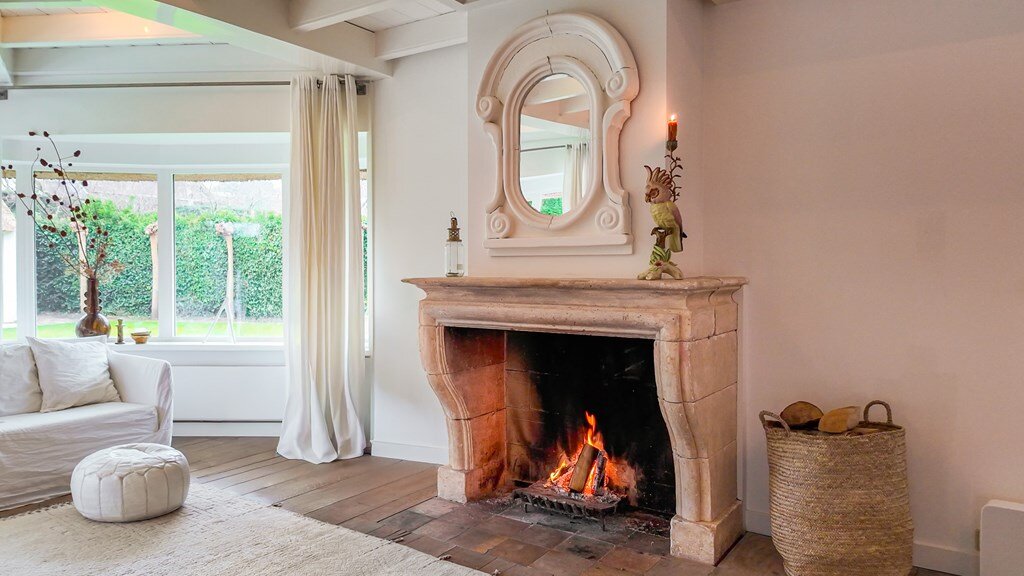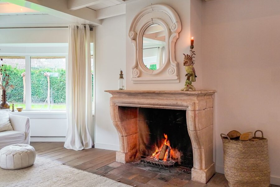 - Lichte, ruime leefruimtes met hoge plafonds en centrale open haard