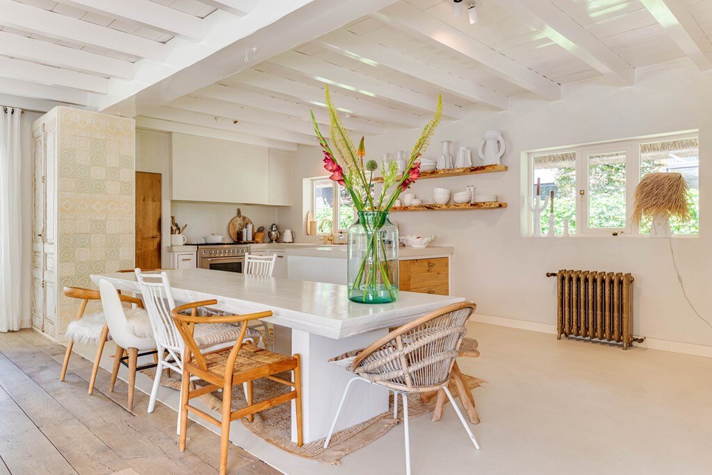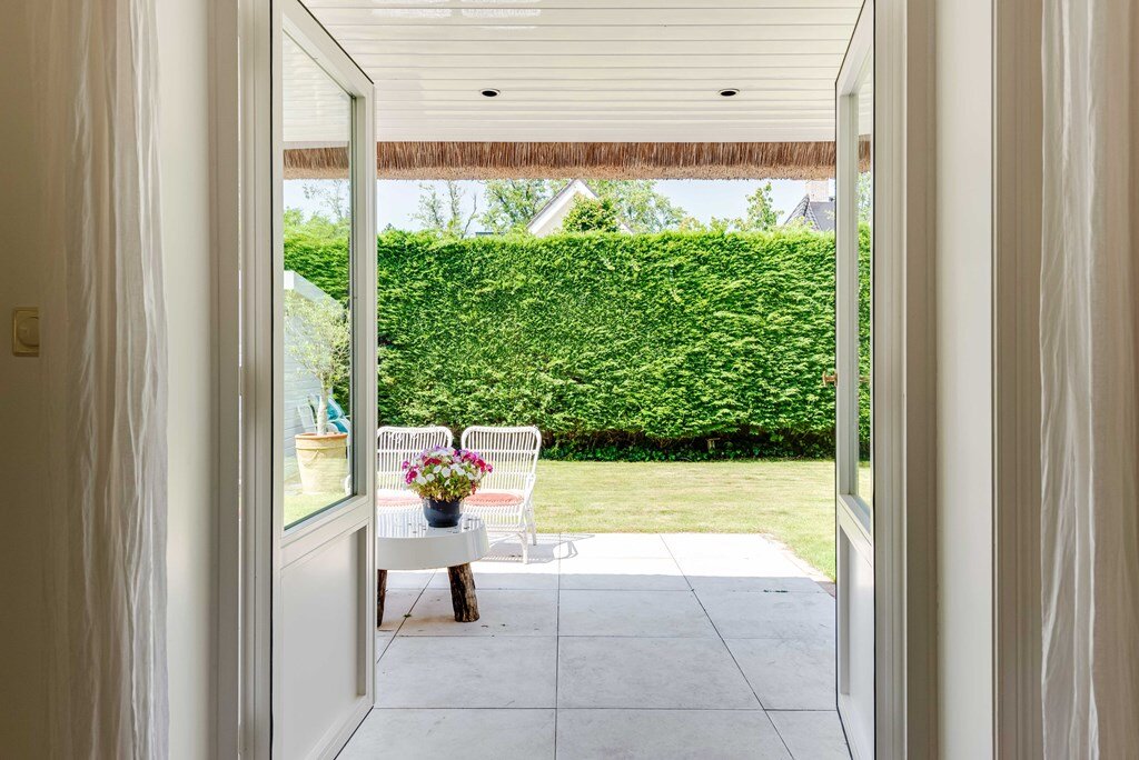 De leefruimtes lopen soepel in elkaar over en openen naar de tuin, waardoor binnen en buiten mooi met elkaar verbonden zijn. Grote ramen en openslaande deuren laten overal veel natuurlijk licht binnen, waardoor het huis een warme en zonnige sfeer heeft. De woonkeuken, volledig verbouwd in 2023, is royaal en rustig van sfeer en vormt het hart van het huis. Vanuit de keuken loop je direct het terras op, met een buitenhaard een fijne plek om buiten te zitten.
