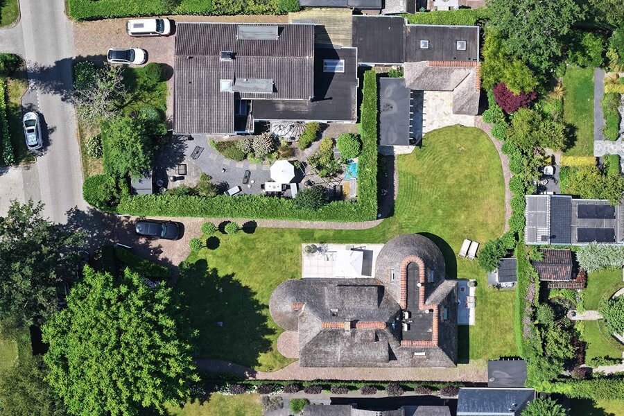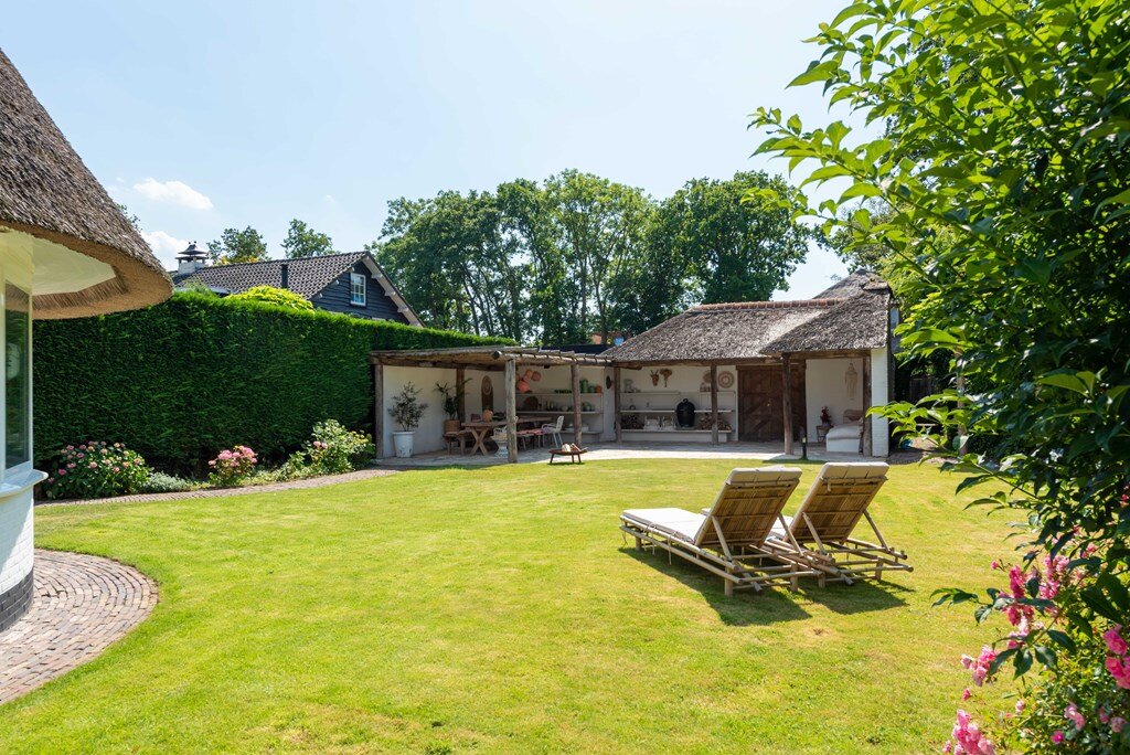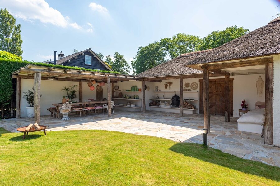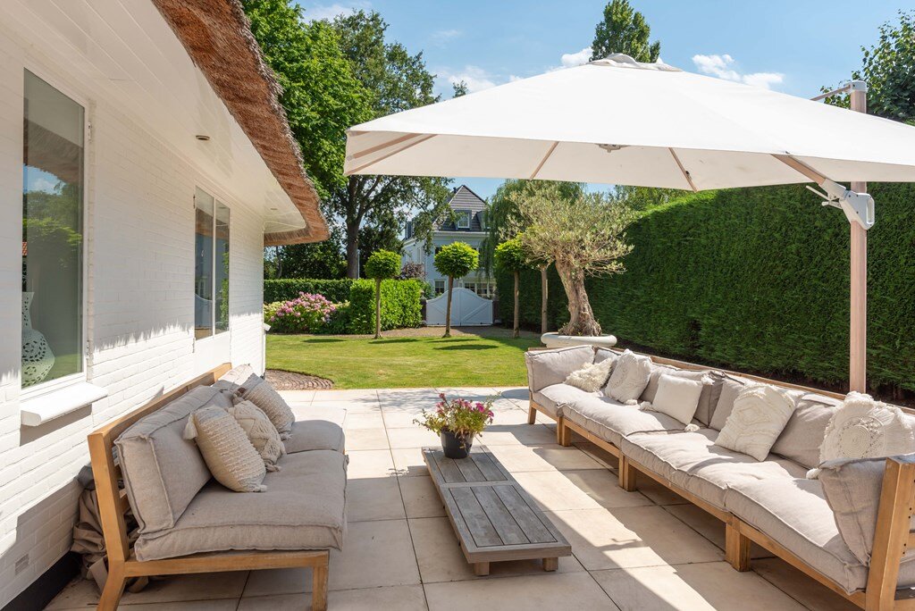 De tuin ligt rondom het huis en voelt totaal besloten en volwassen, met overal hoge hagen voor volledige privacy. De ligging van de tuin biedt zon en schaduw gedurende de hele dag: ’s ochtends aan de voorzijde, ’s middags op de westzijde en ’s avonds aan de achterzijde. Meerdere terrassen zorgen ervoor dat je altijd een plek in zon of schaduw kunt vinden. Een bijzondere plek is de overdekte buitenkeuken, volledig uitgevoerd in stijl met het huis en voorzien van verwarming op vier plaatsen, zodat je hier ook in de winter of tijdens lange avonden comfortabel kunt zitten.