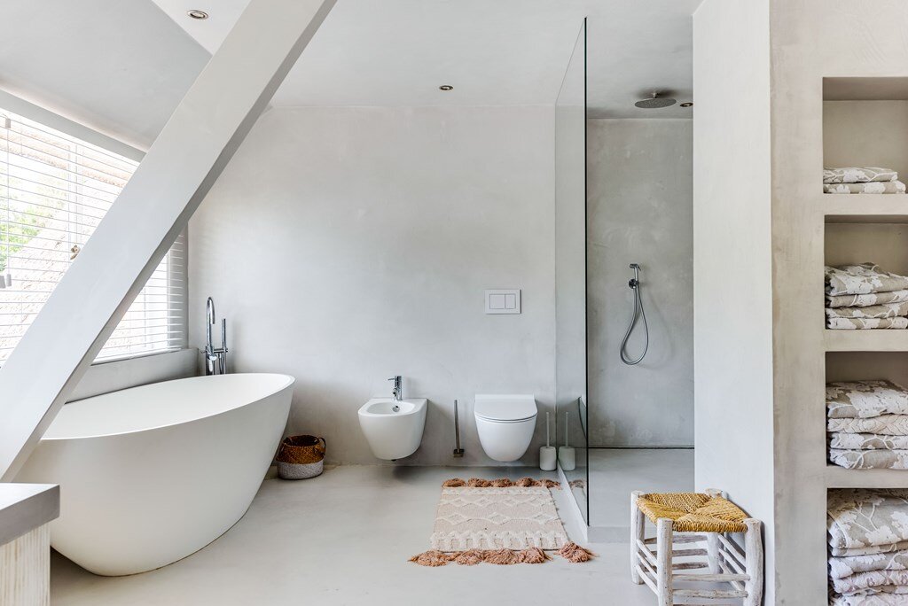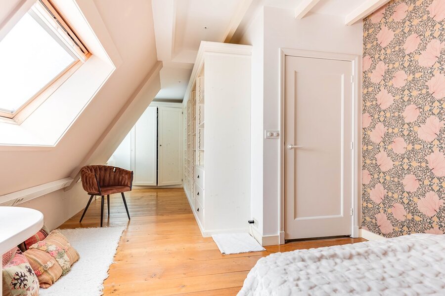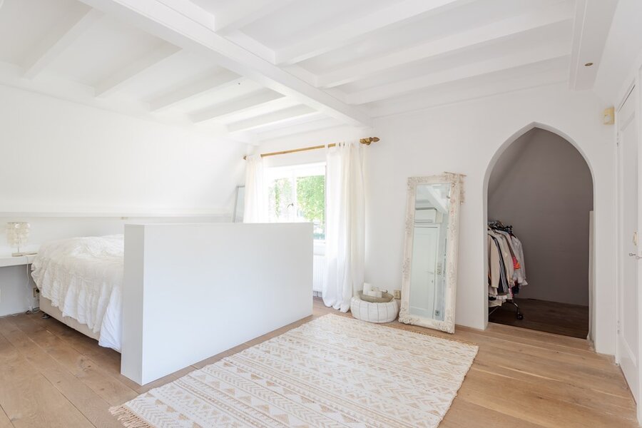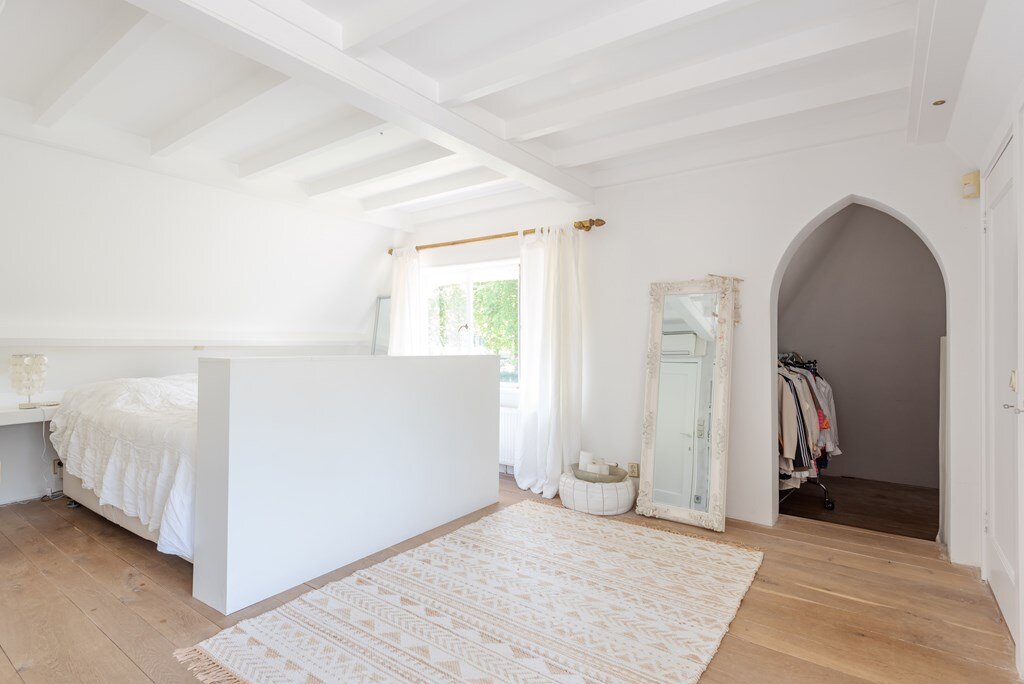Op de eerste verdieping bevinden zich drie ruime en lichte slaapkamers. De hoofdslaapkamer is een plek van rust en comfort, met een ensuite badkamer voorzien van vloerverwarming, ligbad, inloopdouche, toilet en bidet, en daarnaast een fraaie inloopkast. De andere slaapkamers delen een tweede badkamer met stoomdouche en extra toilet, eveneens stijlvol en verzorgd uitgevoerd. Boven de eerste verdieping bevindt zich een royale vliering die zich over de gehele woning uitstrekt. Deze is bereikbaar via een vlizotrap en biedt enorm veel bergruimte en eventuele uitbreidingsmogelijkheden voor de toekomst.