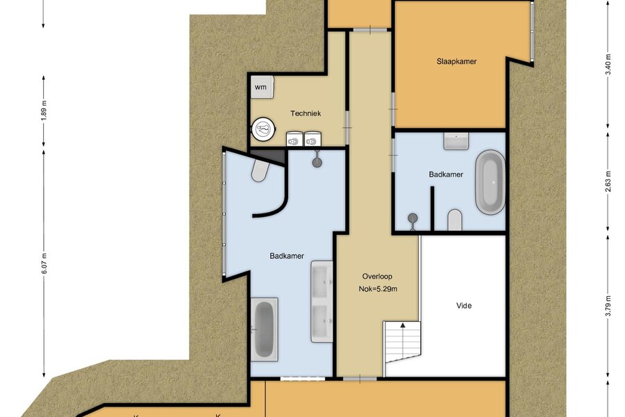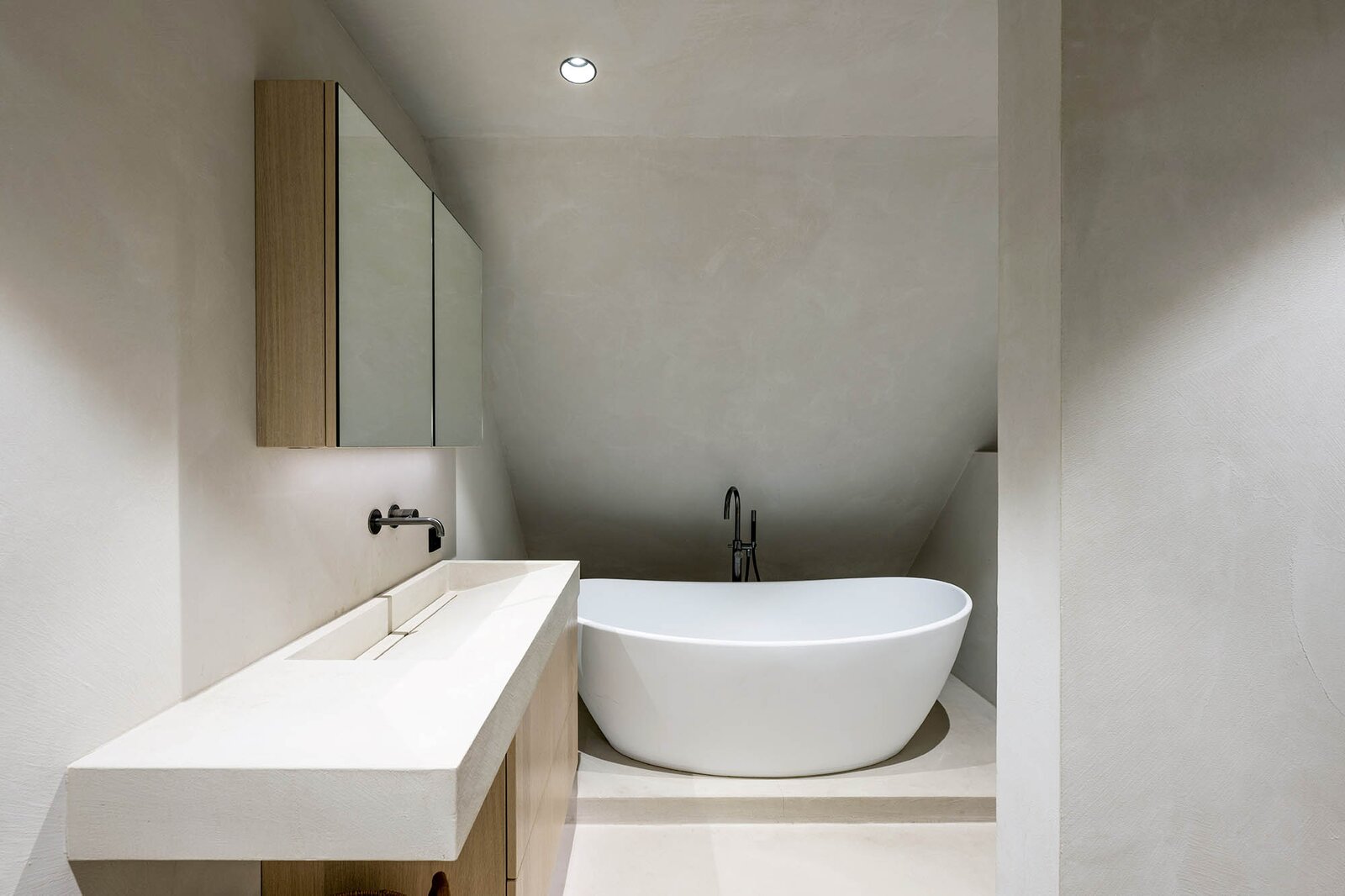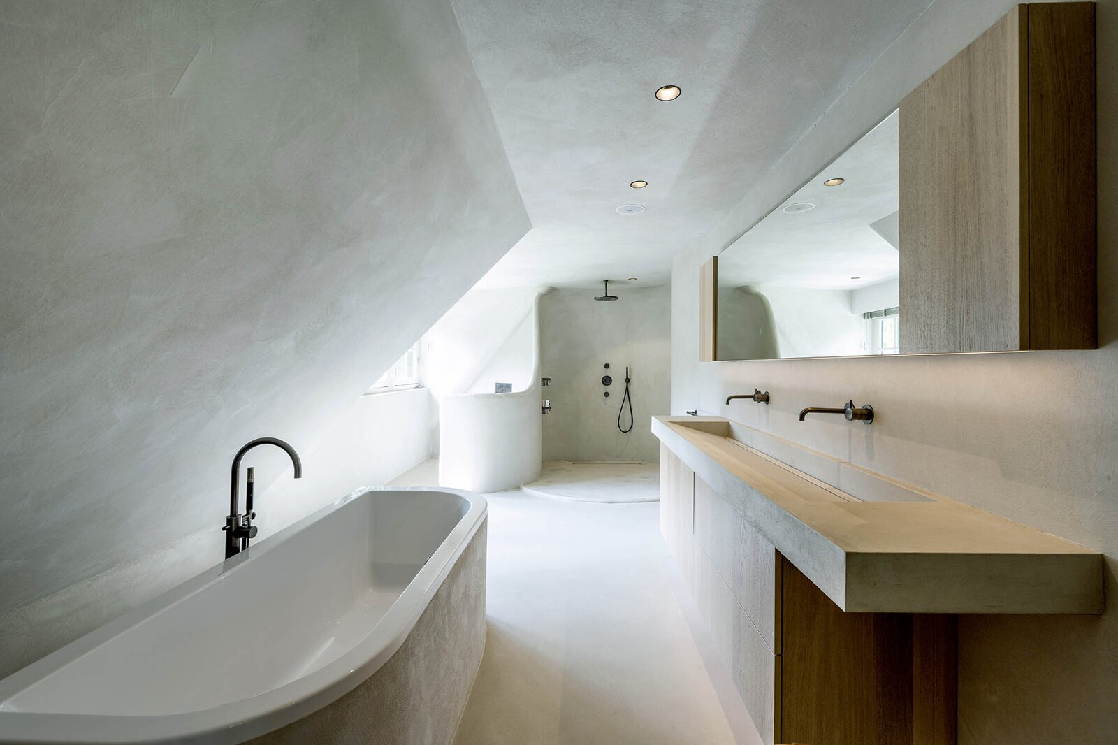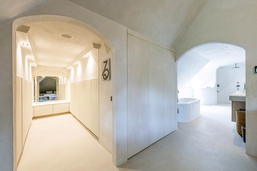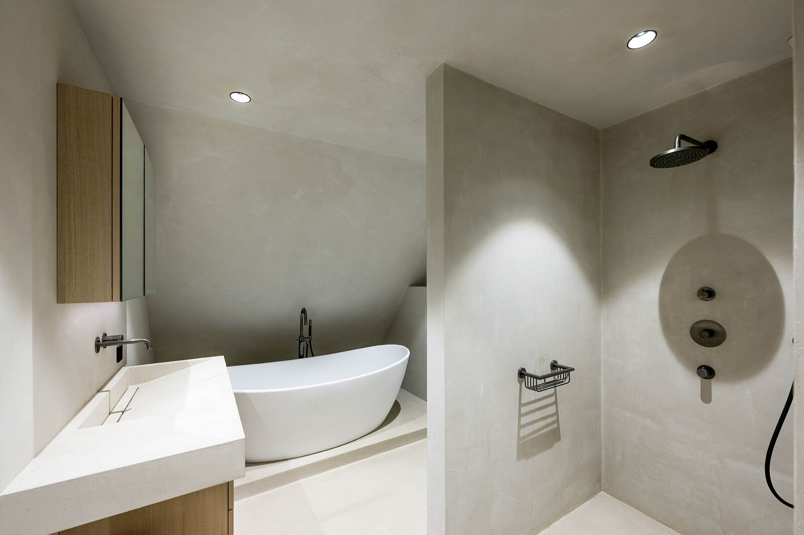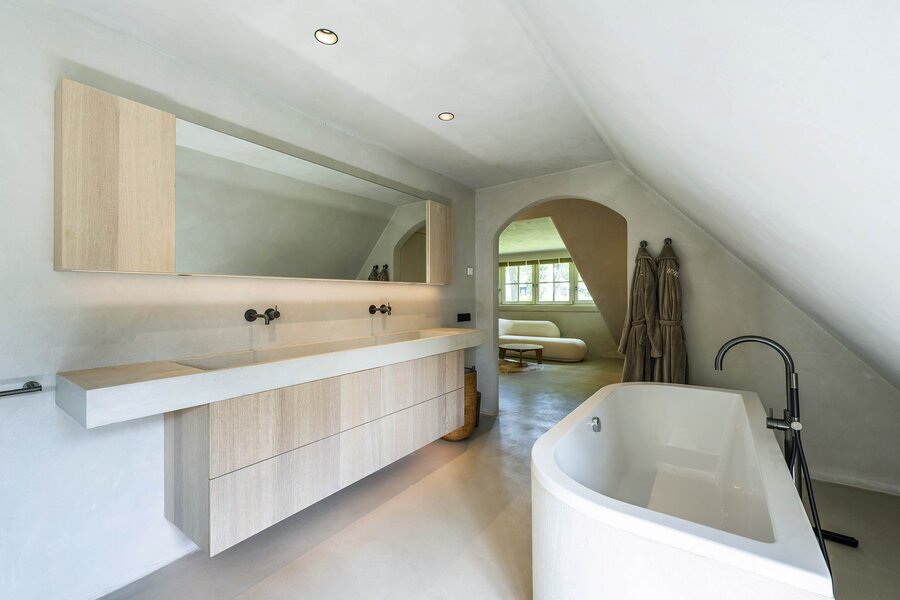 De indeling vervolgt zich op de eerste verdieping met een indrukwekkende masterbedroom, compleet met walk-in closet en een badkamer als een spa, waarin rust en luxe samenvloeien met een ligbad, inloopdouche en airconditioning.