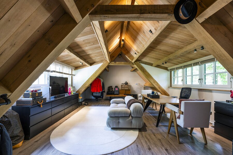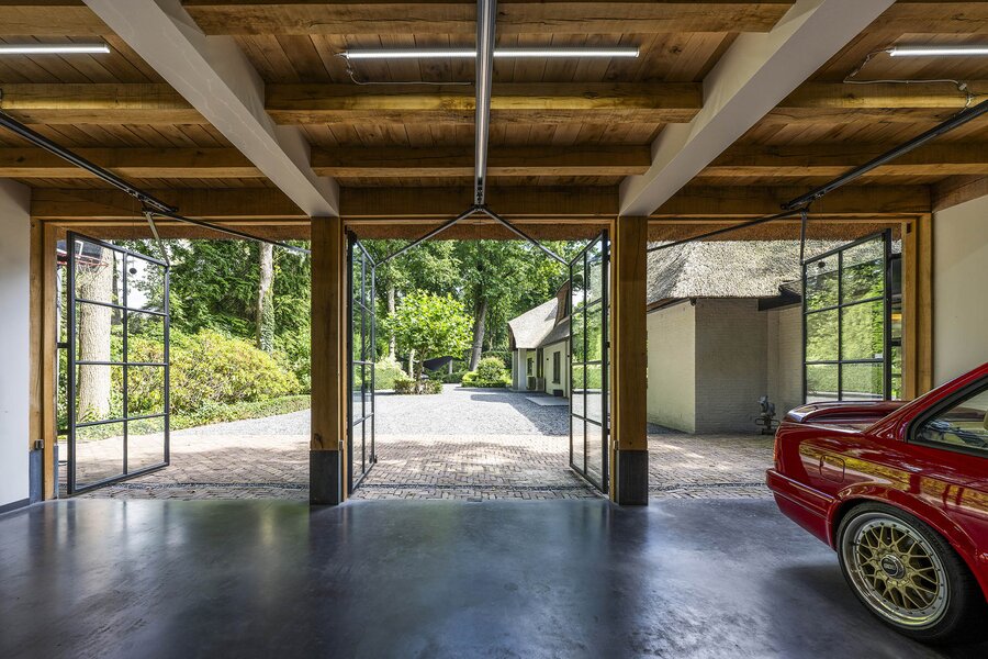 Naast de royale slaapkamers en badkamers, biedt het landhuis praktische luxe met een inpandige garage en een bijzondere driedubbele vrijstaande garage van 60m2, inclusief gastenverblijf van 56m2 – perfect voor vrienden, familie of als inspirerende werkruimte.