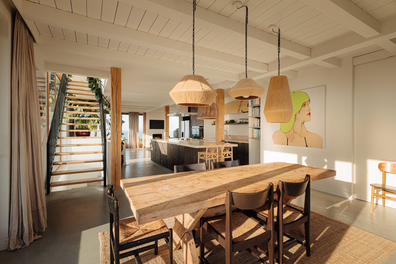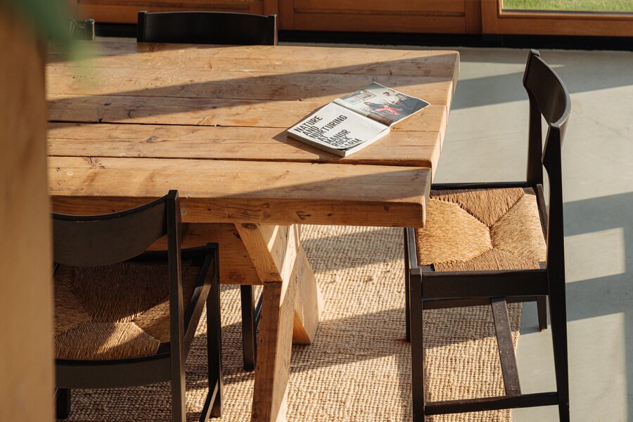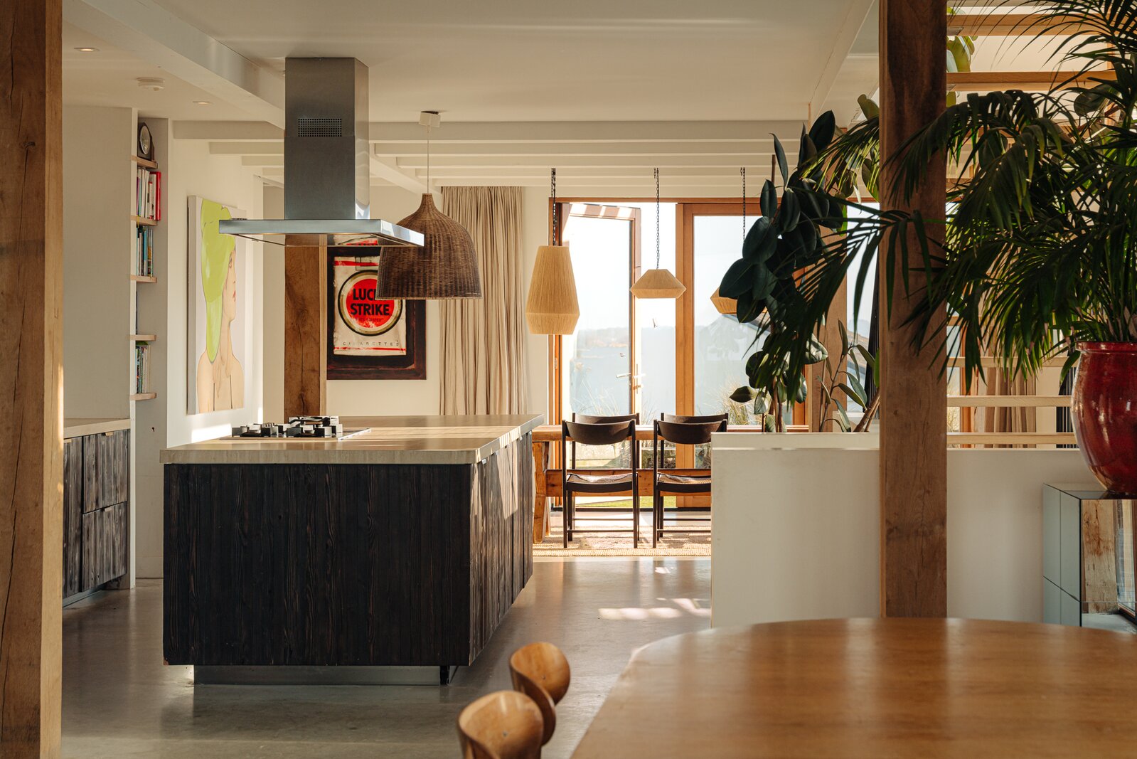 Centraal bevindt zich het eetgedeelte met de ruim opgezette open keuken en