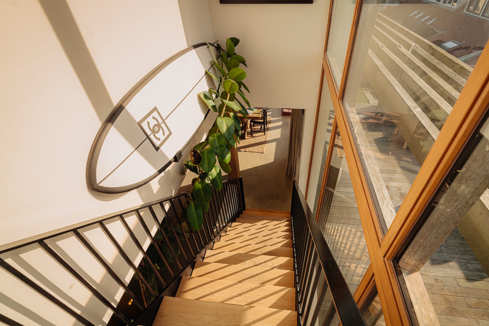 De centraal geplaatste open trap biedt toegang tot de verdiepingen, het souterrain en de garage.