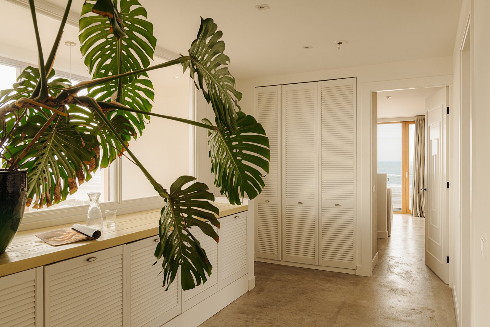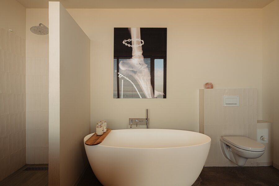 badkamers. De master bedroom aan de voorzijde biedt een prachtig uitzicht op strand en zee en heeft een eigen luxe en-suite badkamer met dubbel wastafelmeubel, vrijstaand ligbad, inloopdouche en wc. Daarnaast is er volop kastruimte en een ruime walk-in closet.
