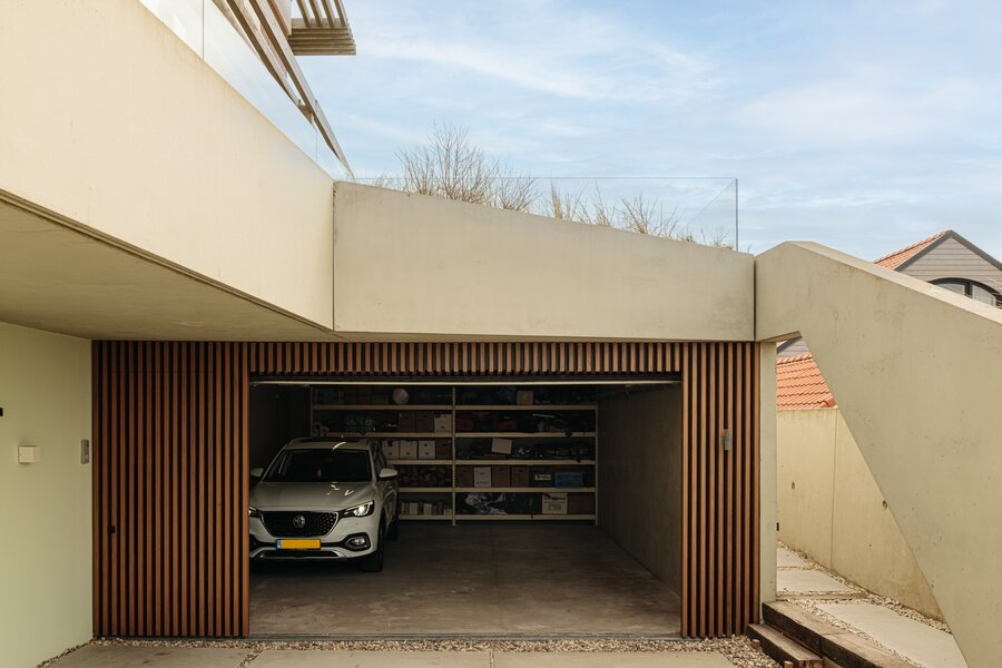 De hal biedt daarnaast toegang tot een technische ruimte met installaties, een praktische bijkeuken met wasmachineopstelling en de ruime inpandige garage (ca. 52 m²). Deze garage is voorzien van een elektrisch bedienbare roldeur met houten afwerking en biedt plaats aan twee auto’s, evenals extra bergruimte.