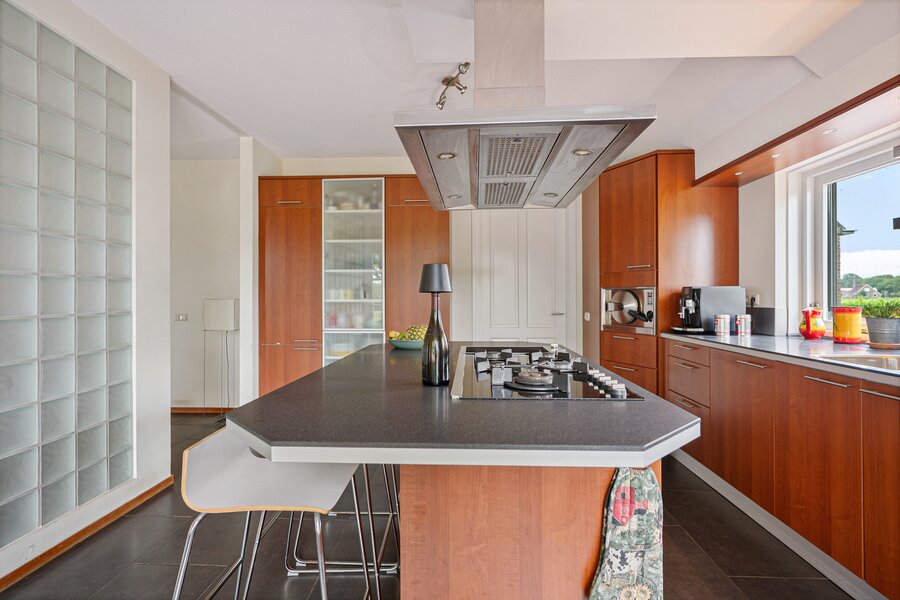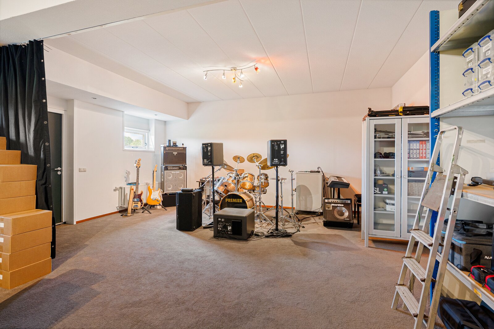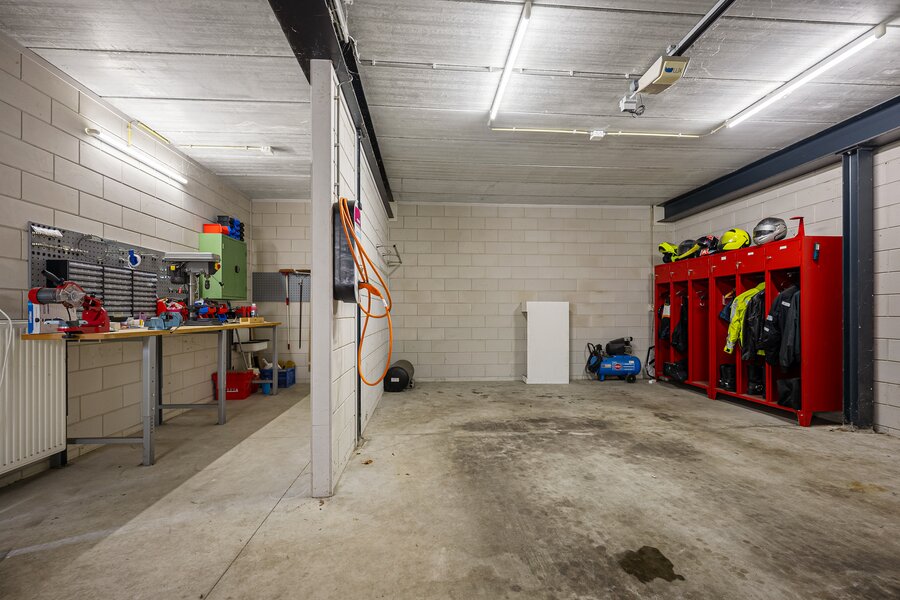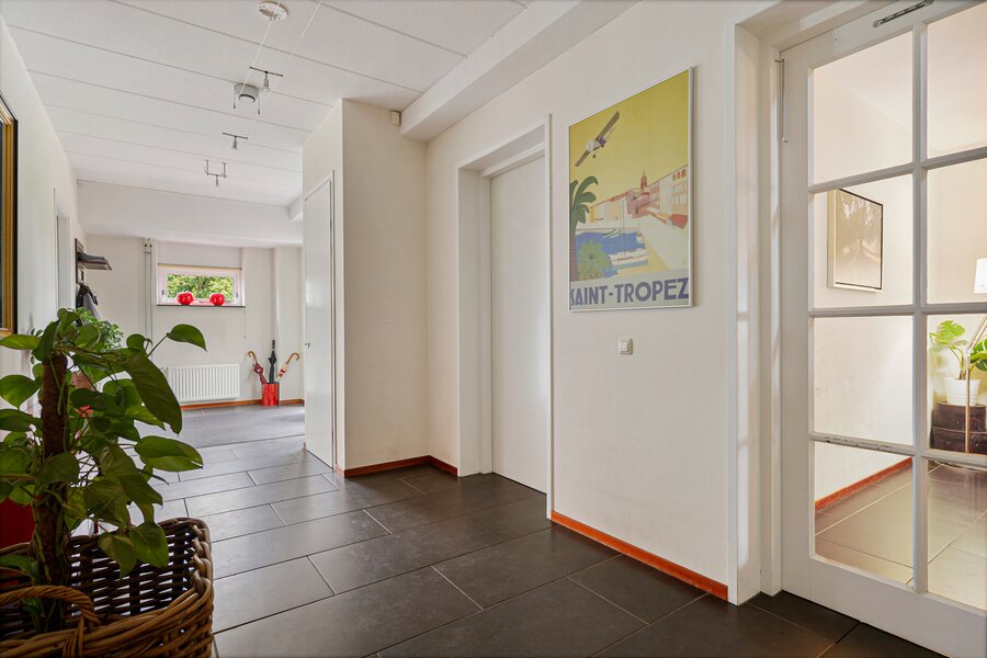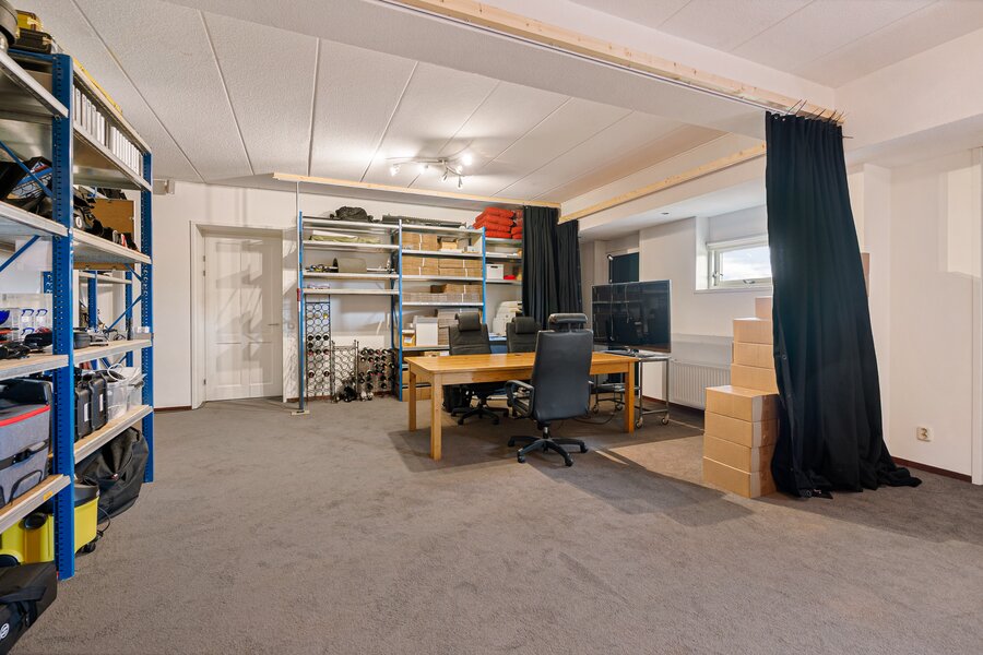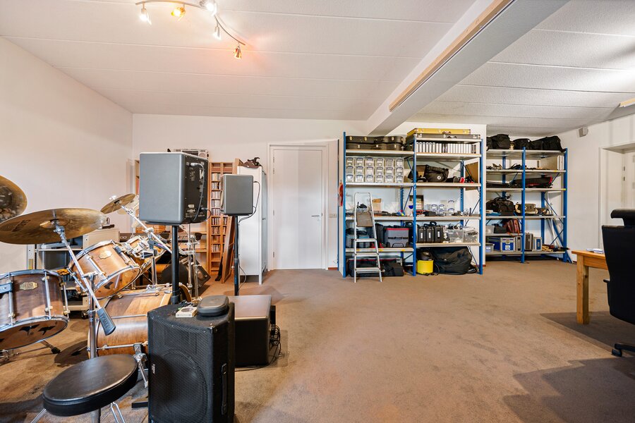 Grote hal, toilet, royale living met bibliotheek v.v. gashaard, een ruime eetkamer en een grote woonkeuken (samen 85 m2) voorzien van diverse inbouwapparatuur, tussenhal met toegang naar een grote geluidsdichte studio c.q. muziekkamer van 56 m2 die ontworpen is om makkelijk op te splitsen in twee aparte vertrekken, bijkeuken en een inpandige schuur c.q. werkplaats en een garage, met betonvloeren, elektrische laadpaal, krachtstroom, heater en meerdere grote sectionaaldeuren.