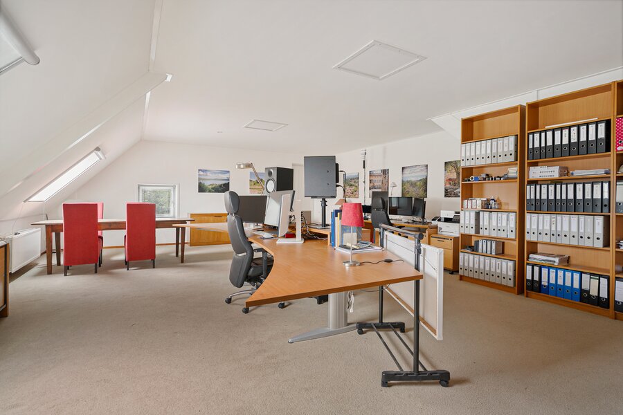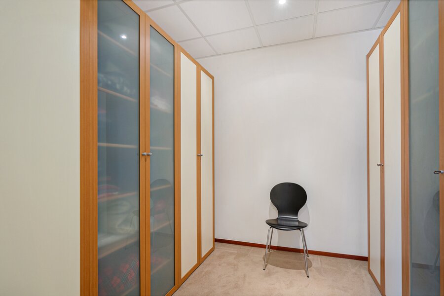 Grote overloop met toegang naar 3 slaapkamers: de master-bedroom (27 m2) met walk-in closet en eigen badkamer v.v. vloerverwarming, ligbad, douche, dubbele wastafel en toilet plus twee slaapkamers (9 en 15 m2), een garderobe-kamer en een tweede badkamer met douche, wastafel en toilet. Voorts bevindt zich op de 1e verdieping een grote multifunctionele ruimte van 54 m2 voorzien van airco. De ruimte is thans in gebruik is als kantoor met archiefruimte maar is ook geschikt voor andere doeleinden.