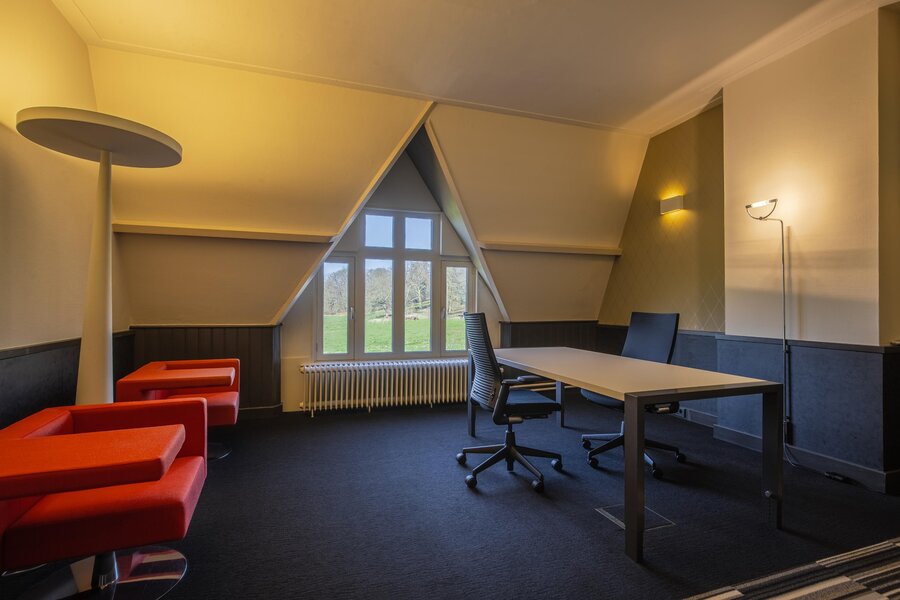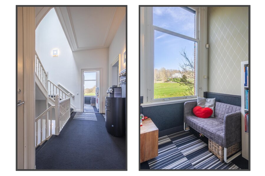 Via het indrukwekkende trappenhuis bereikt u de eerste verdieping met een zeer ruime overloop, een toiletruimte met aparte fontein en een bergkast. De voor- en achterkamer staan met elkaar in open verbinding en kunnen desgewenst worden gescheiden met authentieke en-suite deuren; beide kamers zijn voorzien van originele vaste kasten en eveneens airconditioning. De voorste kamer heeft schuifdeuren naar het balkon aan de voorzijde, met een prachtig uitzicht over het groen en het glooiende park. De achterkamer biedt middels schuifdeuren toegang tot een royale veranda, die een fraai uitzicht biedt op de verzorgde achtertuin. Vanaf de veranda leidt een wenteltrap naar de lager gelegen tuin. Aan de achterzijde bevindt zich tevens een derde (slaap)kamer op deze verdieping.