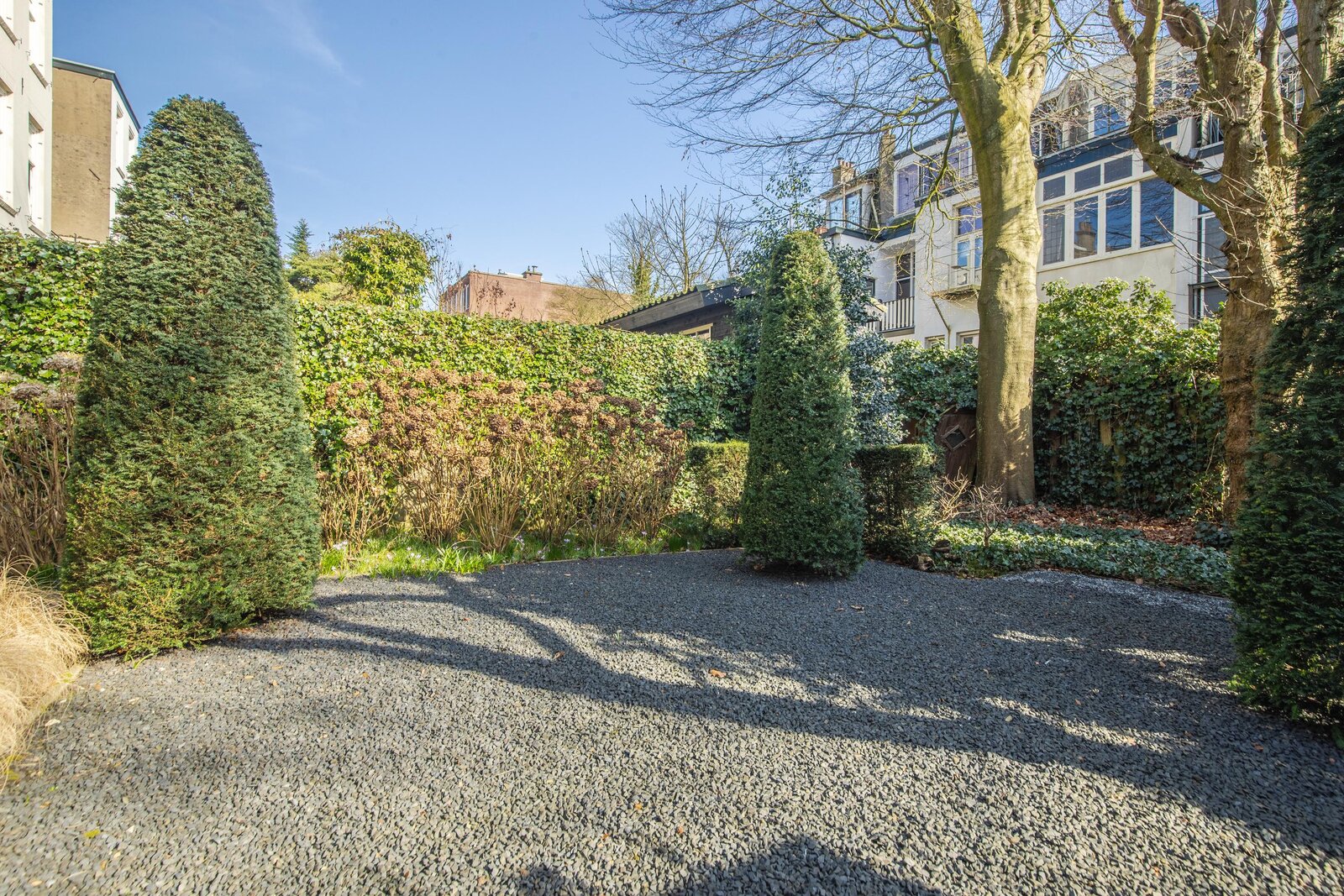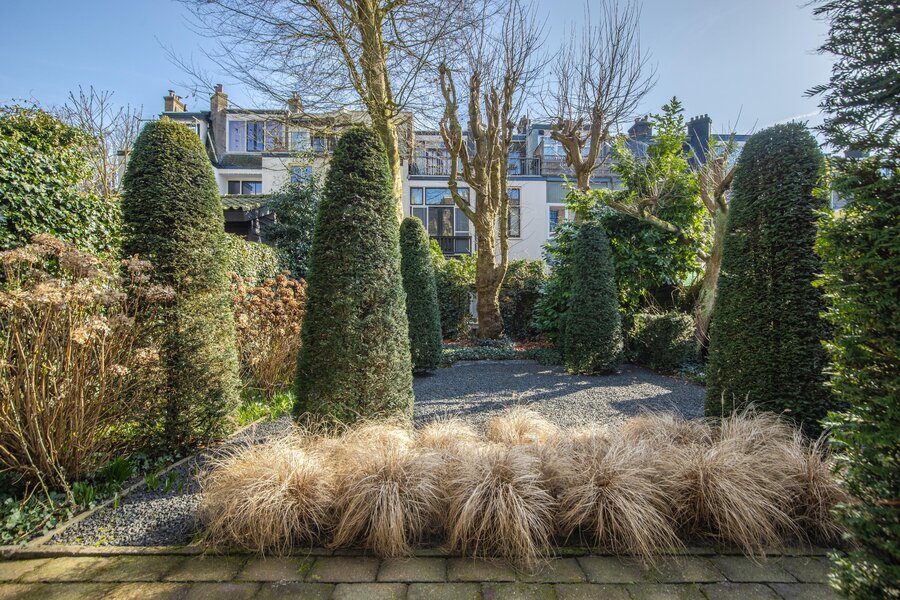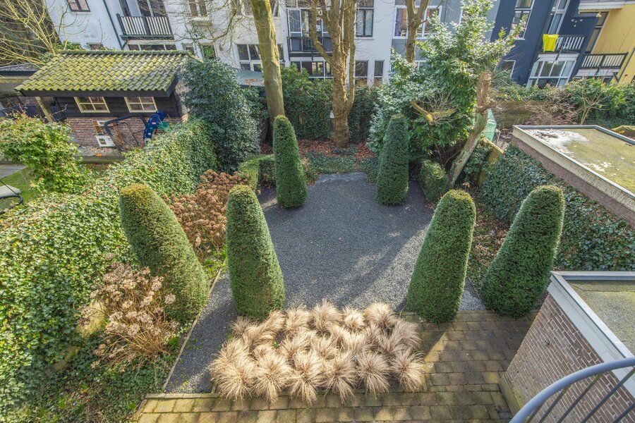 De woning beschikt over een diepe, zonnige achtertuin op het zuidoosten, die perfect past bij het karakter van deze begin 20e-eeuwse wijk. De tuin is rijk aan volwassen bomen, zorgvuldig aangelegde borders en direct aan het huis ligt een royaal terras. Daarnaast biedt een gedeelte met siergrind een fraai contrast en extra onderhoudsvrije ruimte.