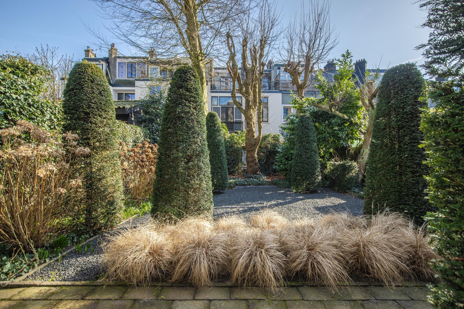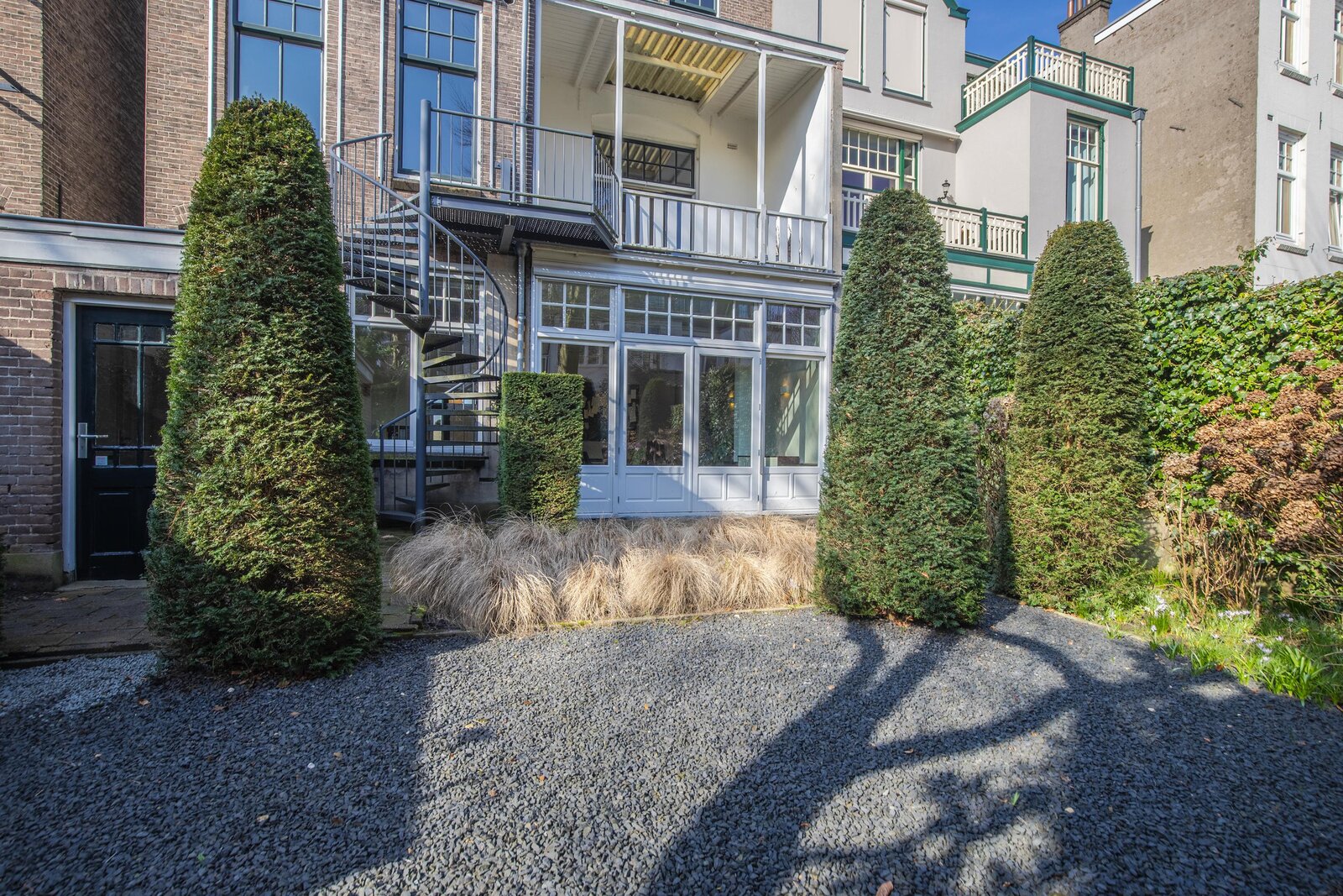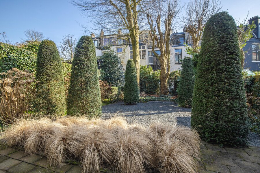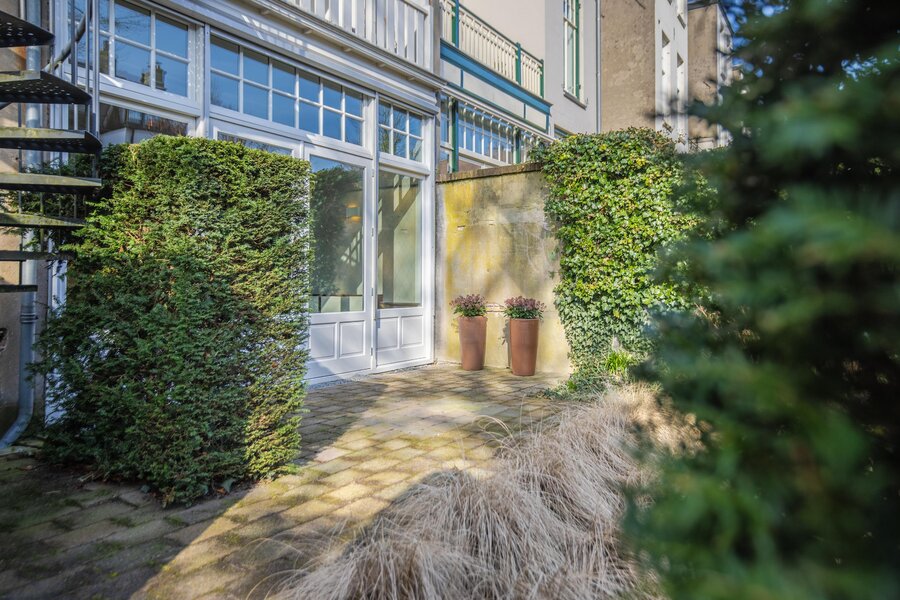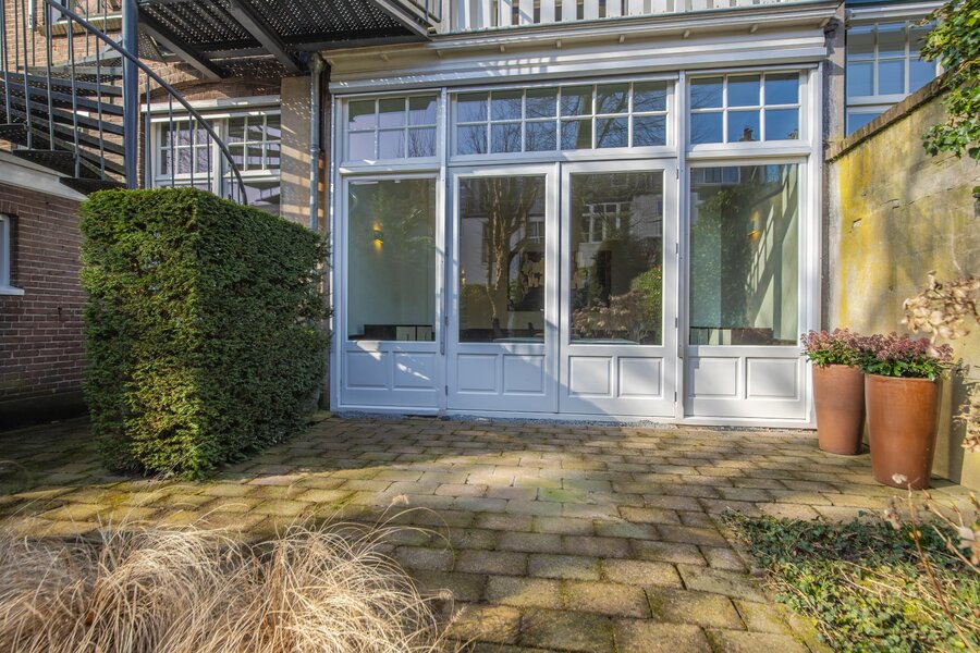 Achter de woning strekt zich een uitzonderlijk diepe en sierlijke tuin uit, gunstig gelegen op het zuidoosten. Een oase van rust en privacy, met volop zon en ruimte om te ontspannen.