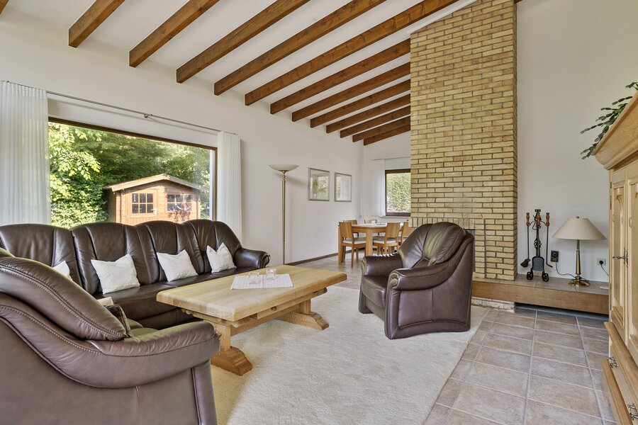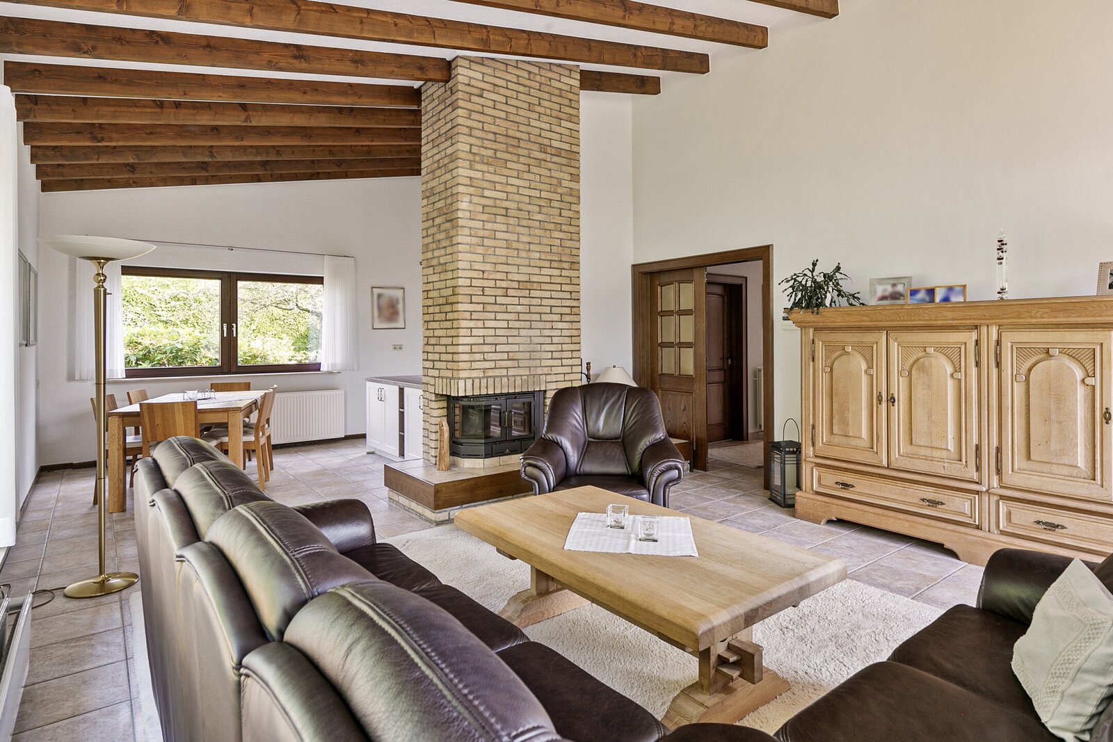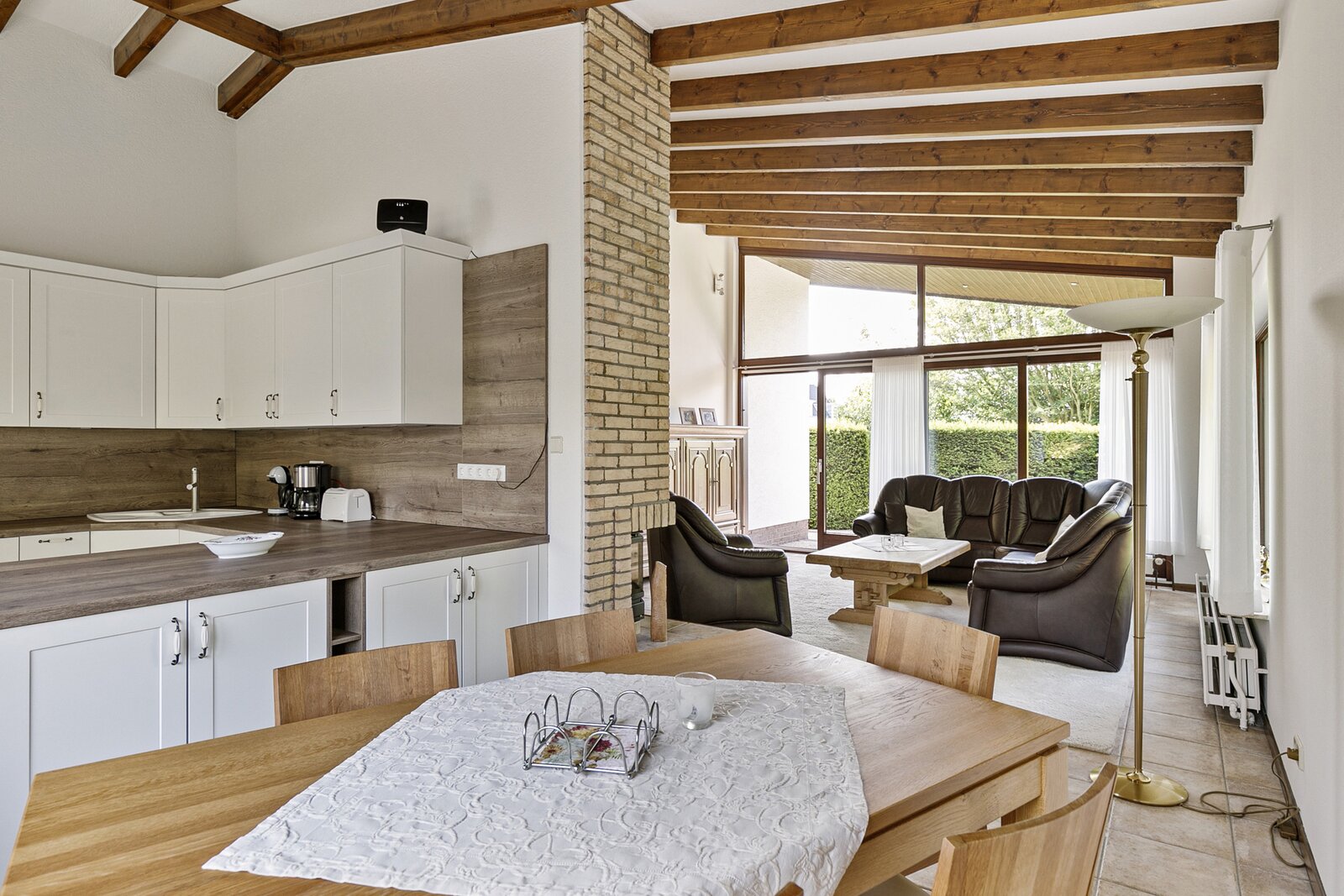 De woonkamer biedt toegang tot de achtertuin; de eethoek en de keuken bevinden zich aan de voorzijde.