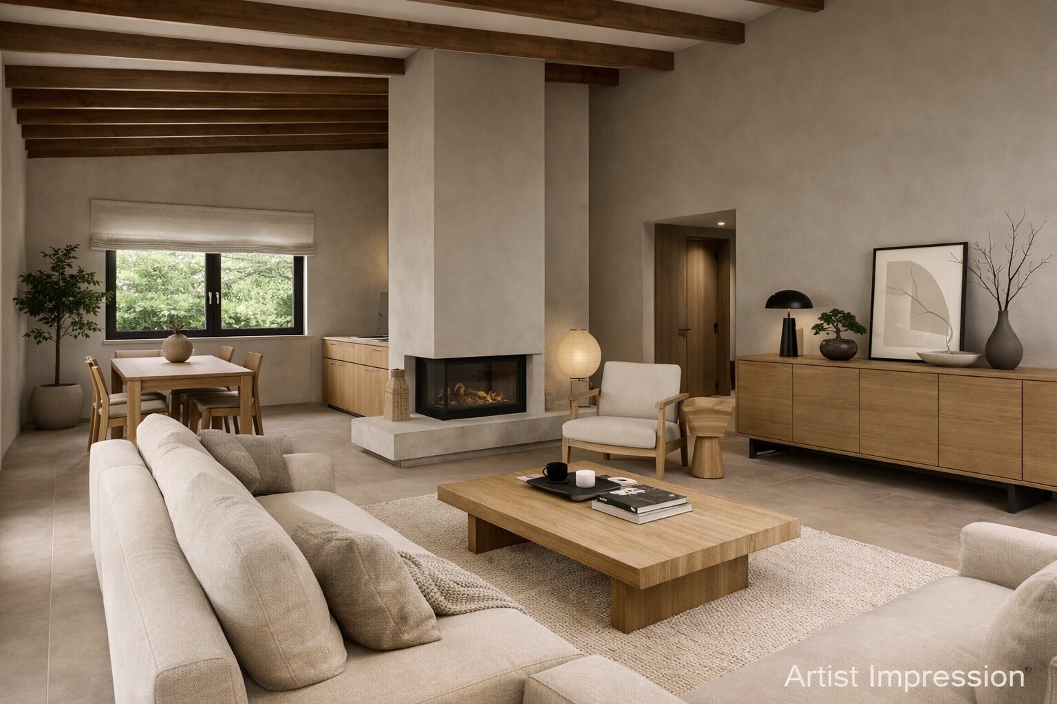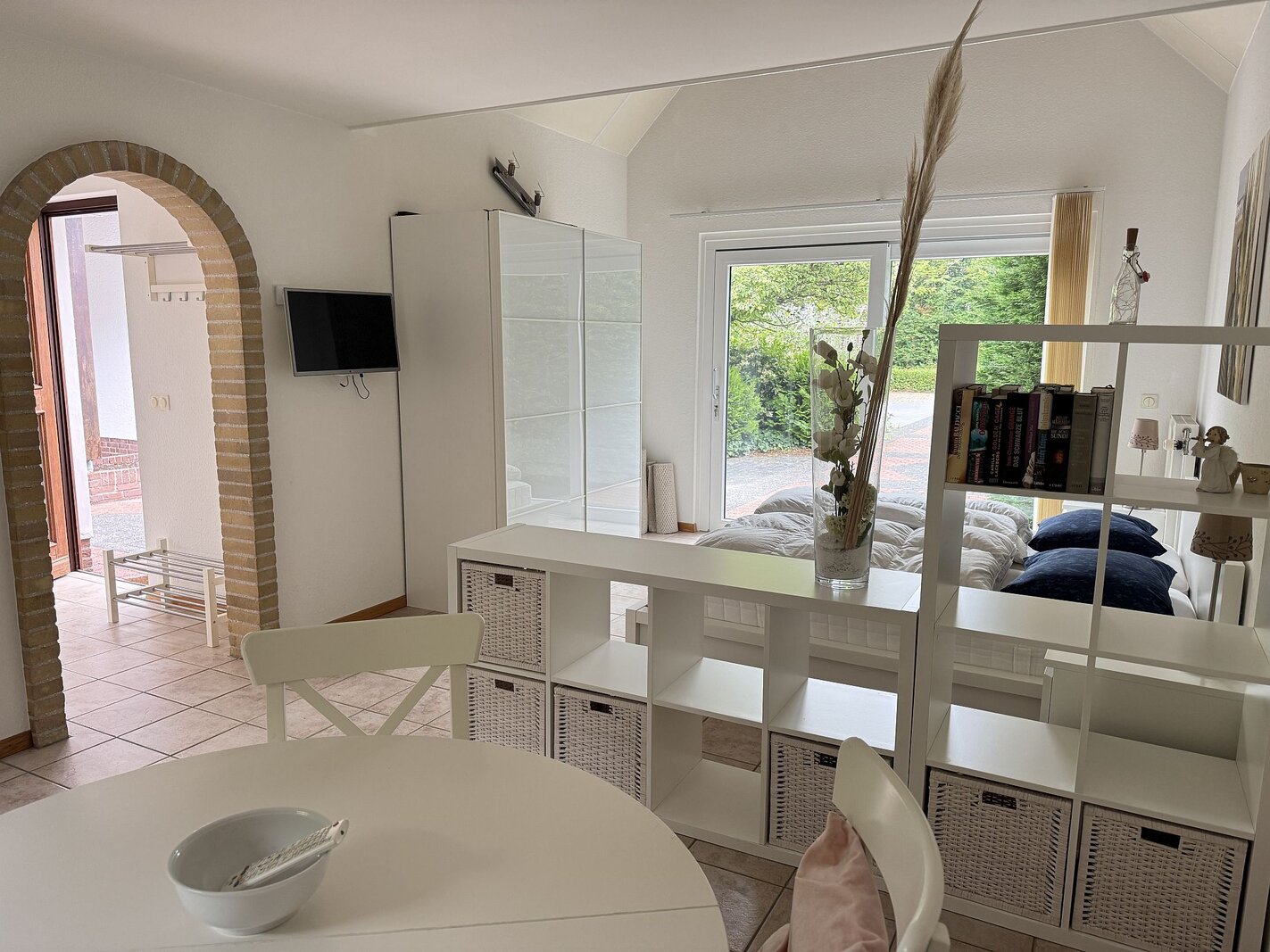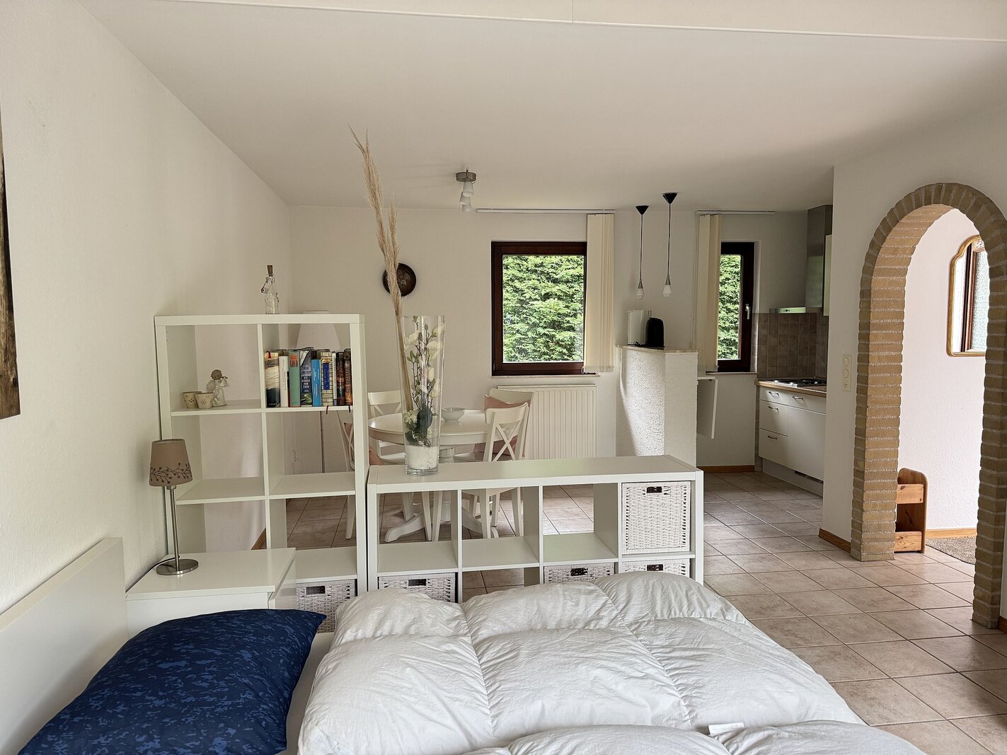 De woonkamer biedt toegang tot de achtertuin; de eethoek en de keuken bevinden zich aan de voorzijde.