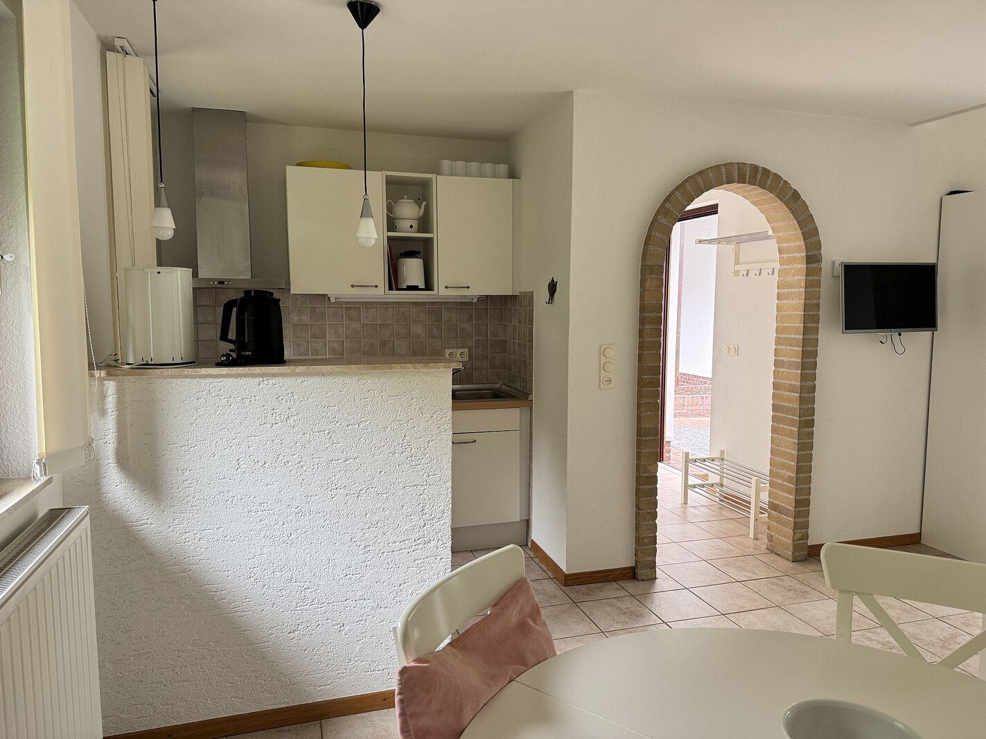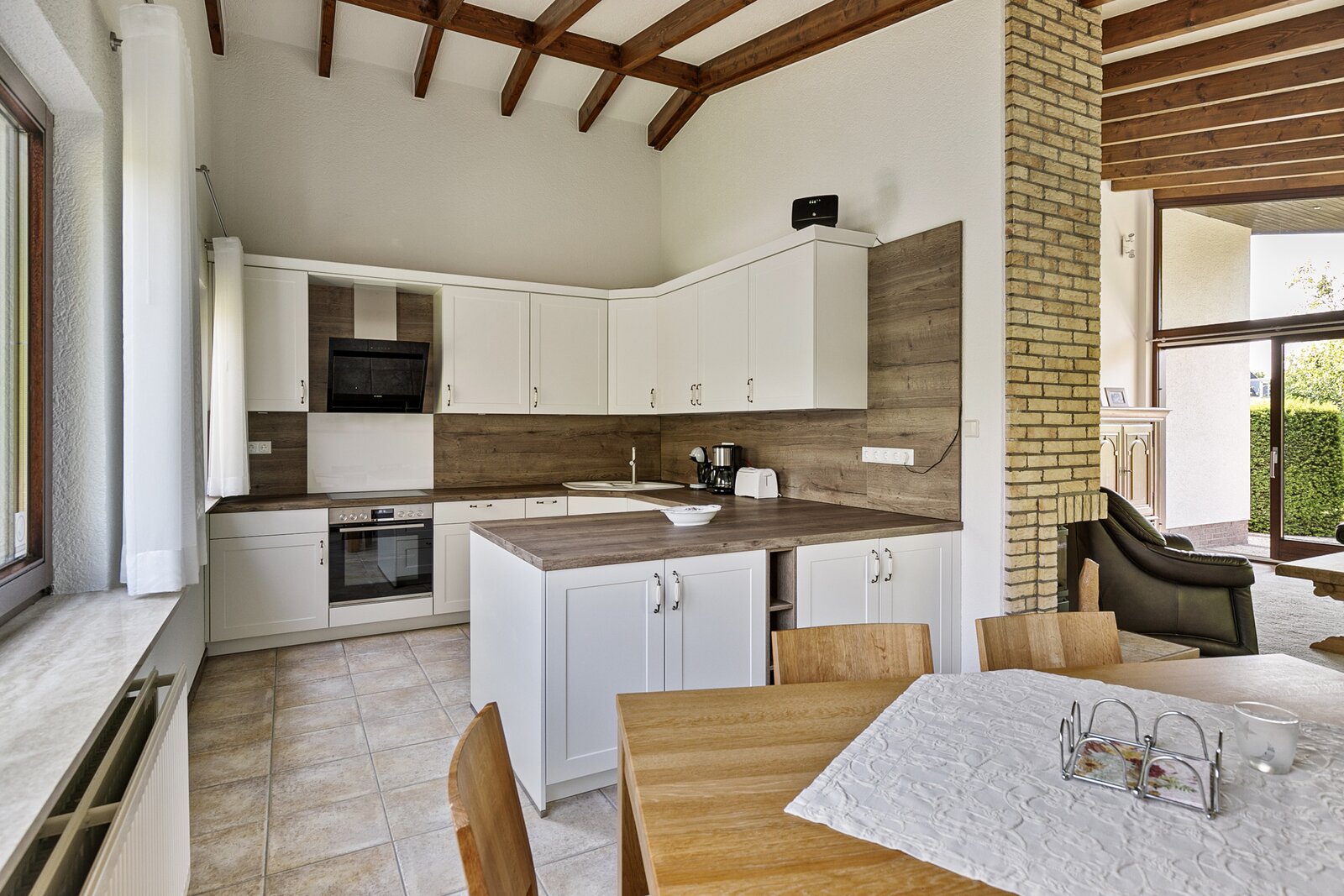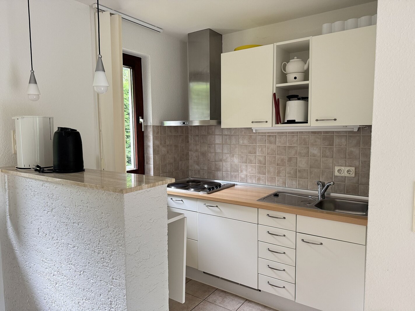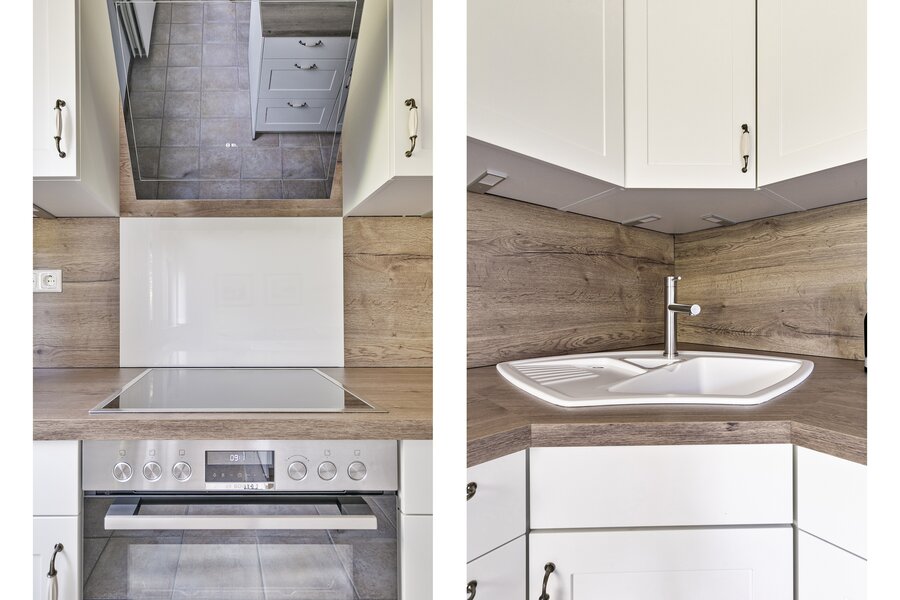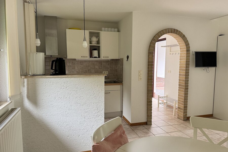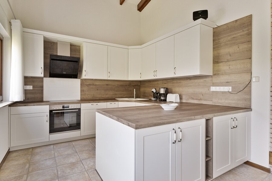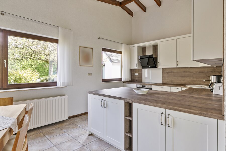 Naast de woonkamer is de open keuken met een gasfornuis en afzuigkap als inbouwapparatuur.