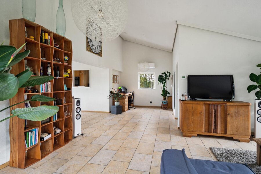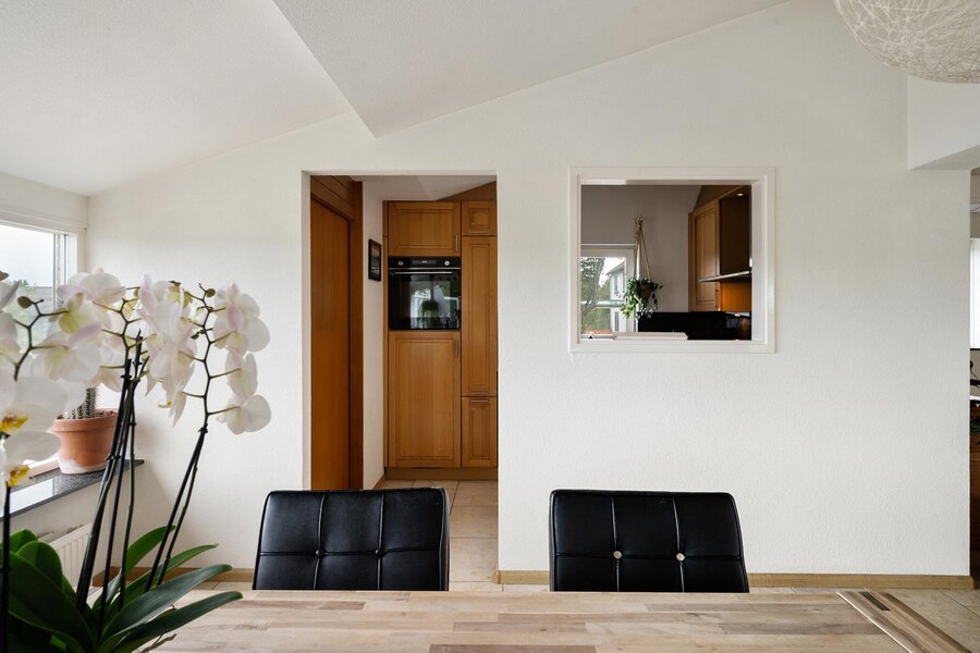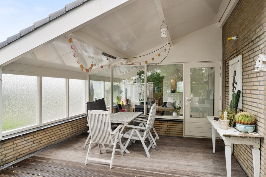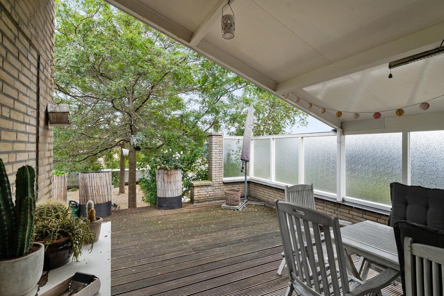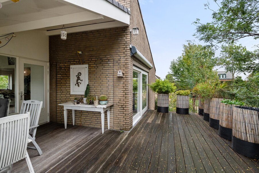 De lichte woonkamer loopt over in een eetgedeelte bij de keuken aan de achterzijde. Ook hier is er toegang tot het houten terras, waarvan een gedeelte zich onder de kap van het dak bevindt. Een heerlijk beschut plekje voor bijvoorbeeld warme zomeravonden.
