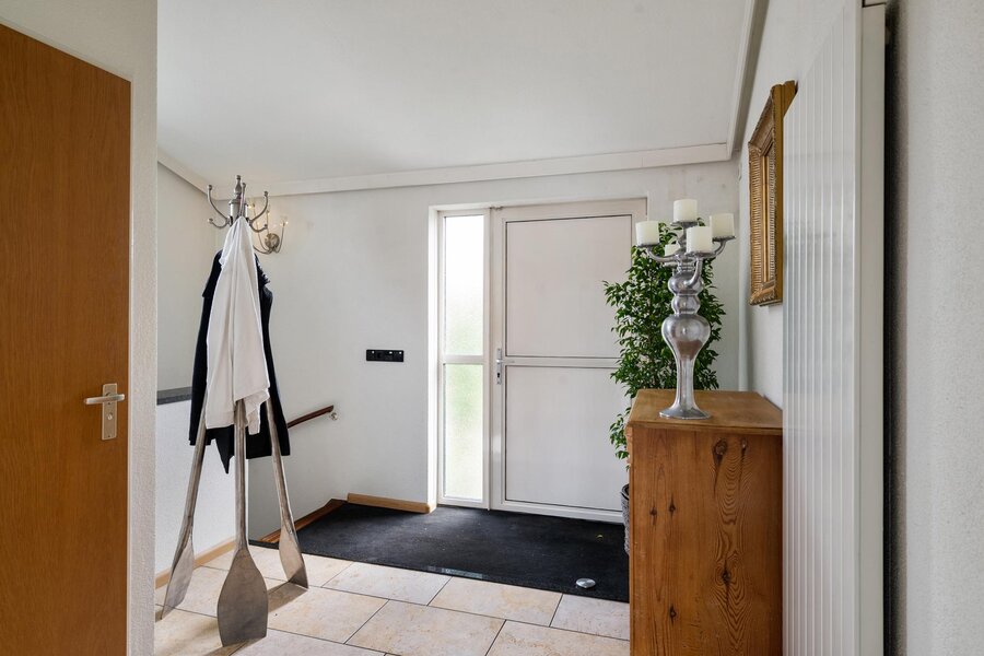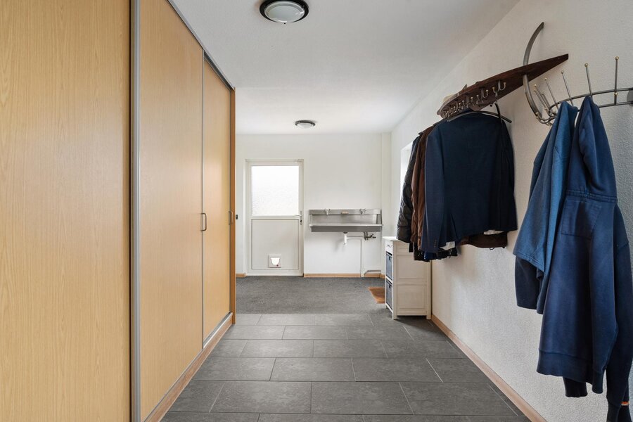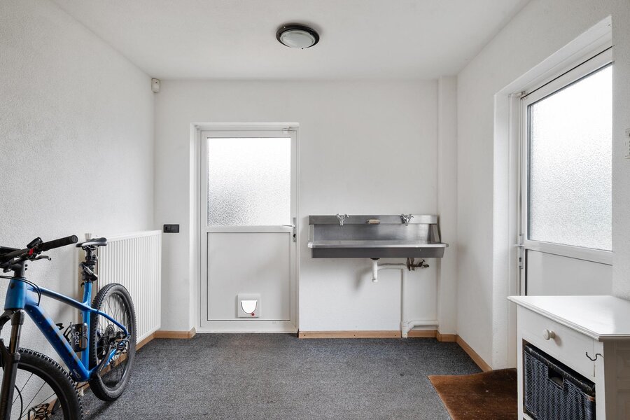 Via de zij-ingang kom je in een grote ruimte met een wandbrede kast met schuifdeuren met veel opslagmogelijkheden en waarachter zich de wasmachine en droger aansluiting bevind. Via en achterdeur heb je toegang tot de (achter)tuin.