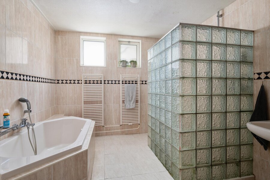 De benedenverdieping beschikt over een badkamer met een ligbad, inloopdouche, toilet, wastafel en handdoekradiator.