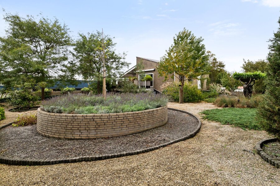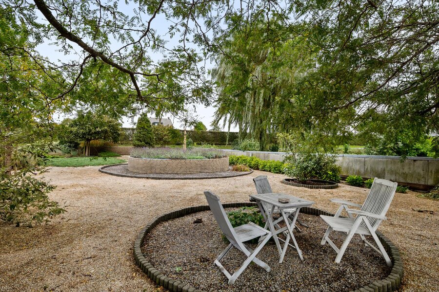De tuin is een oase van rust met aan de achterzijde een poort en een stenen berging met een overdekte opslagplek voor brandhout. De fraai aangelegde tuin heeft grindpaden rondom de plantenperken en een verscheidenheid aan bomen. Je waant je hier, al wandelend in je eigen park, waar elke jaargetijde te genieten is van al het moois dat de natuur te bieden heeft. En het pronkstuk, het beeld van de "Watermeisjes" heeft een prominente plek in de tuin en zal achterblijven voor de nieuwe bewoners om van te genieten.
