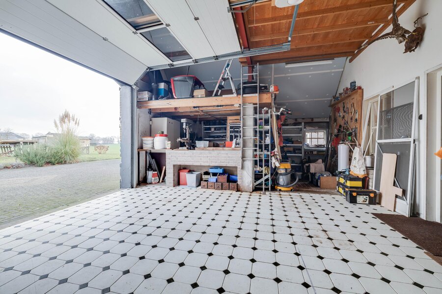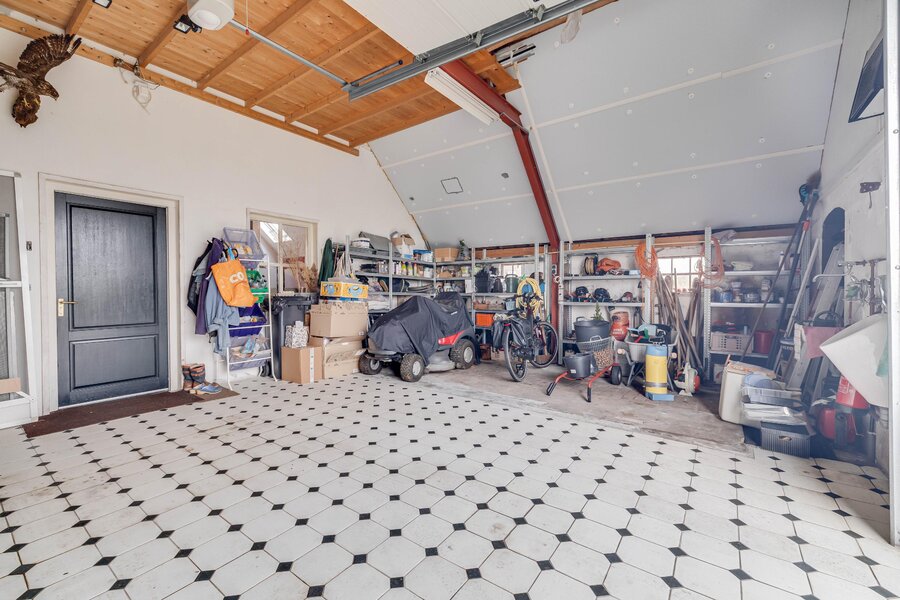 Begane grond: entree, ruime hal met toiletruimte met toilet en fonteintje. Ruime, lichte woonkamer met vrij uitzicht en houtkachel. Ruime woonkeuken met diverse inbouwapparatuur, eetkamer met houtkachel, prachtig uitzicht en toegang tot de tuin. Vanuit de gang bereikt men de multifunctionele ruimte met toegang tot de bijkeuken met aansluiting voor wasapparatuur, luxe badkamer met hoekbad, dubbele wastafel, wandcloset en inloopdouche. Tevens doorloop naar buiten en de beide garages. Eén van de garages heeft een grote roldeur waardoor bijvoorbeeld een camper binnen gestald kan worden