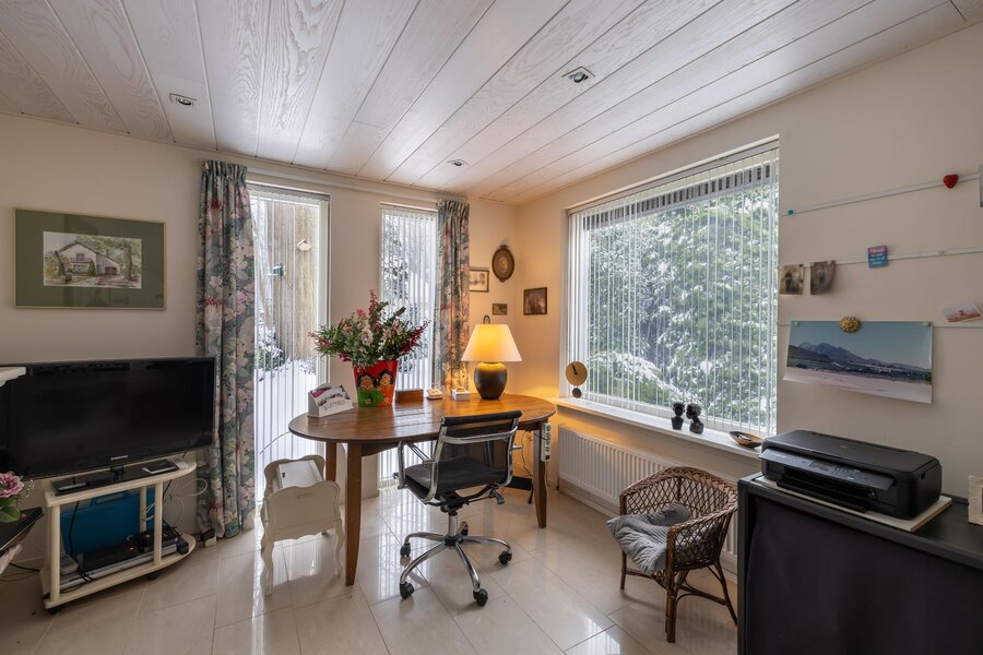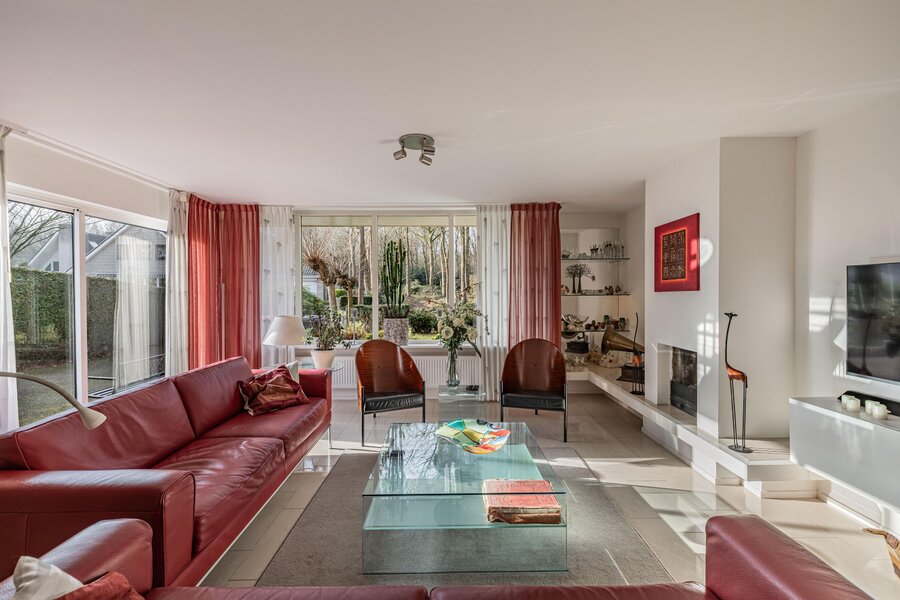 De royale woonkamer is voorzien van een open gashaard en heeft een mooie lichtinval door de grote raampartijen met aan de voorzijde vrij uitzicht op het bos. De begane grond is voorzien van een plavuizenvloer met vloerverwarming.