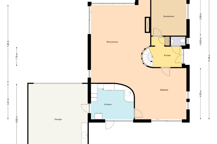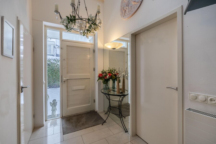 Entree, ruime hal met garderobe en vrij hangend toilet met fonteintje, entree naar de aparte werkkamer aan de voorzijde van de woning; ideaal voor thuiswerken.