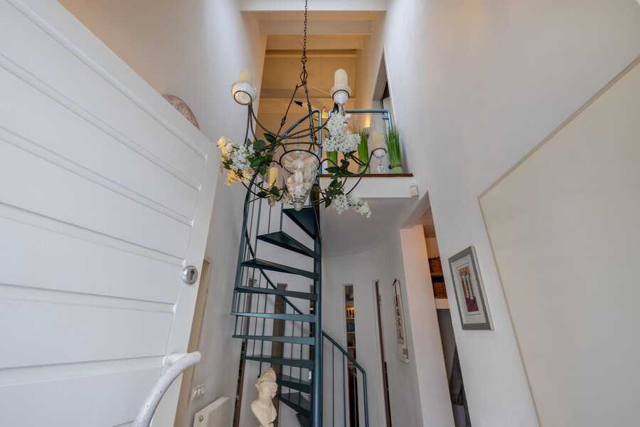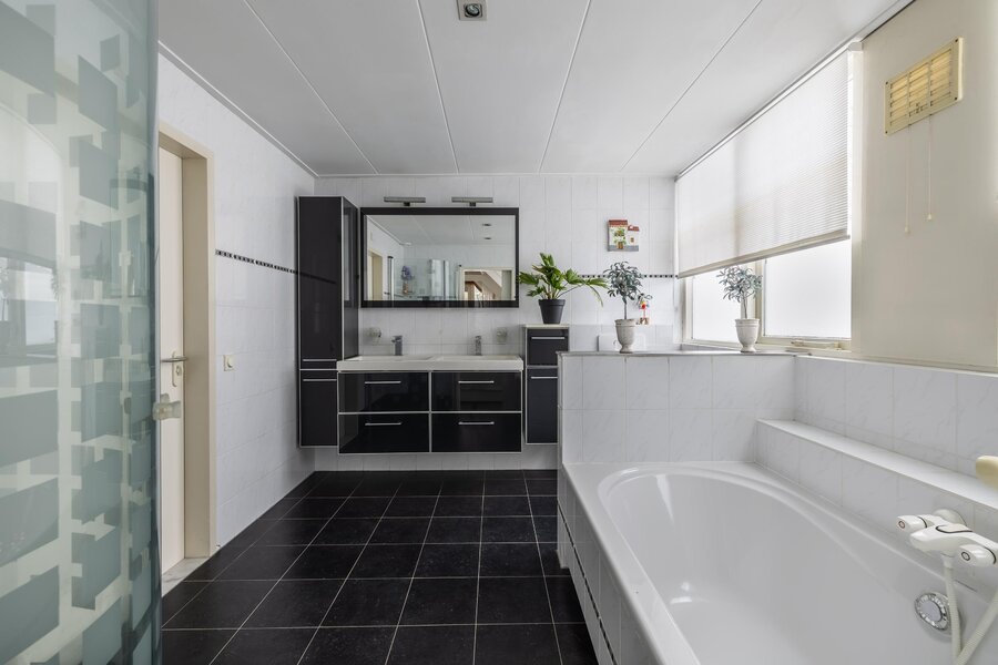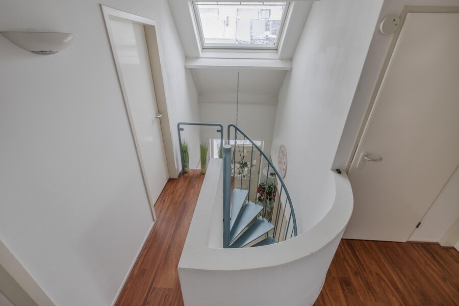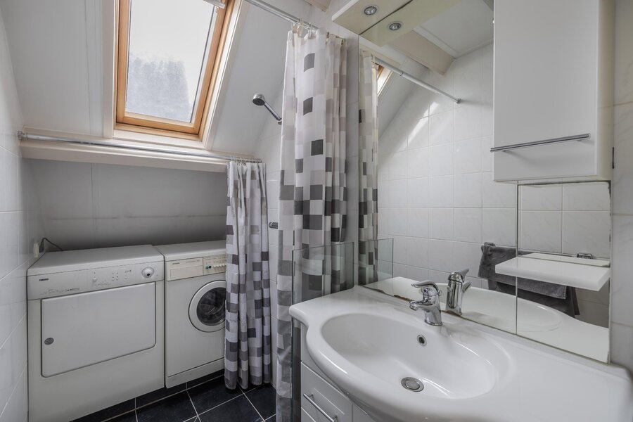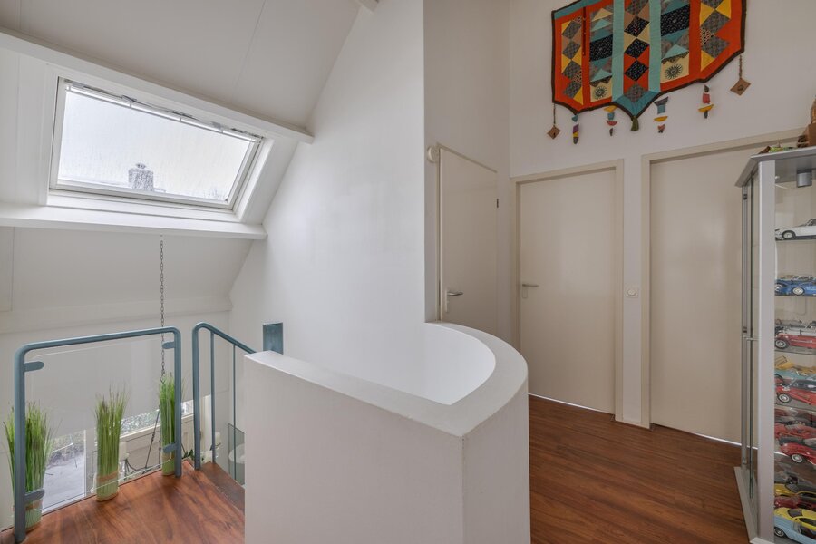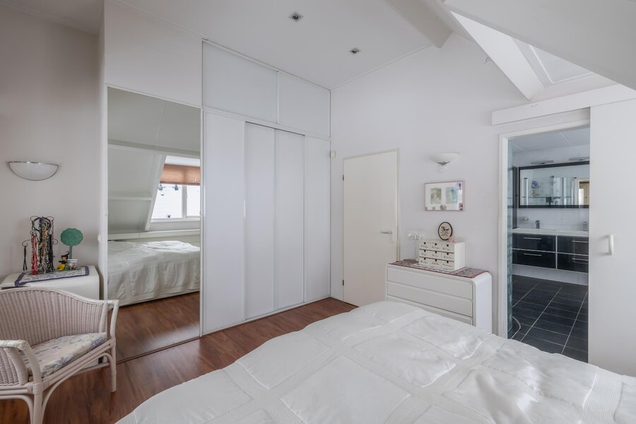 Ruimtelijke overloop met fraai zicht op de entree benedenverdieping. Royale hoofdslaapkamer aan de voorzijde met vaste kasten en directe toegang tot de badkamer voorzien van vloerverwarming, dubbel wastafelmeubel, ligbad, toilet en douche. Aan de voorzijde bevindt zich nog een slaap- of hobbykamer. Beide kamers aan de voorzijde hebben direct toegang tot het balkon over de gehele breedte van de woning. Aan de achterzijde zijn twee ruime slaapkamers gelegen, waarvan één met toegang (middels een vlizotrap) tot de royale bergvliering (stahoogte) met twee hang/legkasten. De tweede badkamer is uitgerust met een douche, wastafel en aansluitingen voor wasmachine en droger.