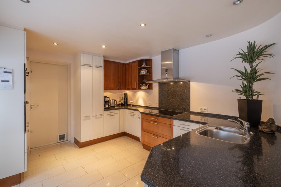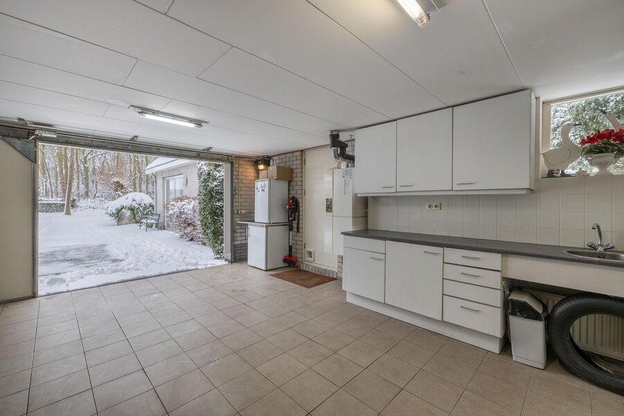 De keuken is onder andere voorzien van een granieten aanrechtblad, vaatwasser, oven, magnetron, elektrische kookplaat, afzuigkap, koelkast en vriezer. Vanuit de keuken is er directe toegang tot de inpandige dubbele garage, voorzien van elektrische schuifdeur (met afstandsbediening), een keukenblok, aanrecht met waterkraan, radiator, veel bergruimte en een deur naar de achtertuin.